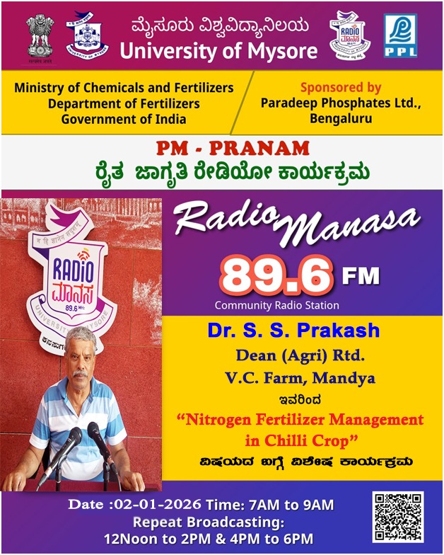 ರೇಡಿಯೋ ಮಾನಸ 89.6 FM ಮೈಸೂರು ವಿಶ್ವವಿದ್ಯಾನಿಲಯ ಮತ್ತು ರಾಸಾಯನಿಕಗಳು ಮತ್ತು ರಸಗೊಬ್ಬರಗಳ ಸಚಿವಾಲಯ ರಸಗೊಬ್ಬರಗಳ ಇಲಾಖೆ ಭಾರತ ಸರ್ಕಾರ ಇವರು ಪ್ರಾಯೋಜಿಸಲ್ಪಟ್ಟಿರುವ ಪಾರದೀಪ್ ಪಾಸ್ಪೇಟ್ಸ್ ಲಿಮಿಟೆಡ್ ಬೆಂಗಳೂರು ಇವರೊಂದಿಗೆ ಜಂಟಿಯಾಗಿ ಆಯೋಜಿಸಿರುವ ವಿಶೇಷ ಸರಣಿ ಕಾರ್ಯಕ್ರಮದಲ್ಲಿ Dr. S. S. Prakash, Dean(Agri) Rtd V. C. Farm, Mandya ಇವರು "Nitrogen Fertilizer Management in Chilli Crop" ವಿಶೇಷ ಕಾರ್ಯಕ್ರಮವು ನಮ್ಮ ರೇಡಿಯೋ ಮಾನಸ CRS 89.6 FM App ಹಾಗೂ 89.6 FM ಕಂಪನಾಂಕದಲ್ಲಿ ದಿನಾಂಕ:02/01/2026ರಂದು ಬೆಳಿಗ್ಗೆ 7 ಗಂಟೆಗೆ ಪ್ರಸಾರವಾಗುತ್ತಿದ್ದು, ಎಲ್ಲಾರು ಸಹ ಕೇಳಬಹುದಾಗಿದೆ. ಇದೇ ಕಾರ್ಯಕ್ರಮವು ಮಧ್ಯಾಹ್ನ 12 ಗಂಟೆಗೆ ಮತ್ತು ಸಂಜೆ 4ಗಂಟೆಗೆ ಮರು ಪ್ರಸಾರವಾಗುತ್ತದೆ. Radio Manasa CRS 89.6 FM App Google Play Store ನಲ್ಲಿ ಲಭ್ಯವಿದ್ದು. ಎಲ್ಲರು Download ಮಾಡ ಬಹುದಾಗಿದೆ. ಅಥವಾ ಈ ಕೆಳಗಿರುವ ಲಿಂಕ್ ಅನ್ನ ಒತ್ತಿ ರೇಡಿಯೋ ಮಾನಸ App ಅನ್ನು Download ಮಾಡಿ ಕೊಂಡು ವಿಶ್ವದಾದ್ಯಂತ ಎಲ್ಲರು ಸಹ ಕೇಳಬಹುದು. https://play.google.com/store/apps/details?id=com.manasa ಪ್ರತಿ ದಿನ ನಮ್ಮ ಮೈಸೂರು ವಿಶ್ವವಿದ್ಯಾನಿಲಯ ಪ್ರಸ್ತುತ ಪಡಿಸುವ ರೇಡಿಯೋ ಮಾನಸದ ಕಾರ್ಯಕ್ರಮವು ಈ ಕೆಳಕಂಡ ಸಮಯದಲ್ಲಿ ಪ್ರಸಾರವಾಗುತ್ತದೆ 7AM to 9AM, 12Noon to 2PM, 4PM to 6 PM.
