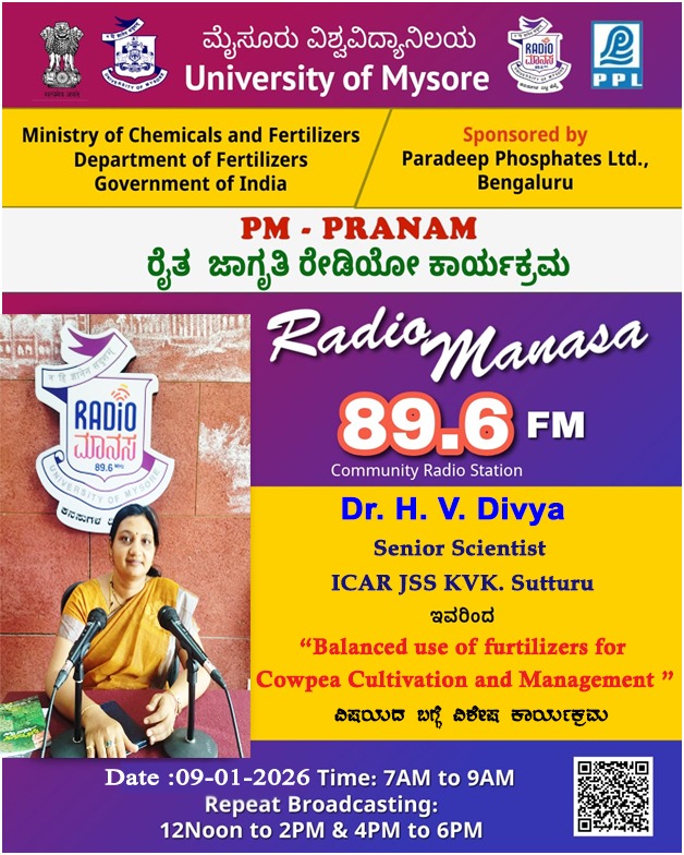 ರೇಡಿಯೋ ಮಾನಸ 89.6 FM ಮೈಸೂರು ವಿಶ್ವವಿದ್ಯಾನಿಲಯ ಮತ್ತು ರಾಸಾಯನಿಕಗಳು ಮತ್ತು ರಸಗೊಬ್ಬರಗಳ ಸಚಿವಾಲಯ ರಸಗೊಬ್ಬರಗಳ ಇಲಾಖೆ ಭಾರತ ಸರ್ಕಾರ ಇವರು ಪ್ರಾಯೋಜಿಸಲ್ಪಟ್ಟಿರುವ ಪಾರದೀಪ್ ಪಾಸ್ಪೇಟ್ಸ್ ಲಿಮಿಟೆಡ್ ಬೆಂಗಳೂರು ಇವರೊಂದಿಗೆ ಜಂಟಿಯಾಗಿ ಆಯೋಜಿಸಿರುವ ವಿಶೇಷ ಸರಣಿ ಕಾರ್ಯಕ್ರಮದಲ್ಲಿ Dr. H. V. Divya, Senior Scientists, ICAR JSS KVK, Suttur ಇವರು " Balanced use of fertilisers for Cowpea Cultivation and Management " ವಿಶೇಷ ಕಾರ್ಯಕ್ರಮವು ನಮ್ಮ ರೇಡಿಯೋ ಮಾನಸ CRS 89.6 FM App ಹಾಗೂ 89.6 FM ಕಂಪನಾಂಕದಲ್ಲಿ ದಿನಾಂಕ:09/01/2026ರಂದು ಬೆಳಿಗ್ಗೆ 7 ಗಂಟೆಗೆ ಪ್ರಸಾರವಾಗುತ್ತಿದ್ದು, ಎಲ್ಲಾರು ಸಹ ಕೇಳಬಹುದಾಗಿದೆ. ಇದೇ ಕಾರ್ಯಕ್ರಮವು ಮಧ್ಯಾಹ್ನ 12 ಗಂಟೆಗೆ ಮತ್ತು ಸಂಜೆ 4ಗಂಟೆಗೆ ಮರು ಪ್ರಸಾರವಾಗುತ್ತದೆ. Radio Manasa CRS 89.6 FM App Google Play Store ನಲ್ಲಿ ಲಭ್ಯವಿದ್ದು. ಎಲ್ಲರು Download ಮಾಡ ಬಹುದಾಗಿದೆ. ಅಥವಾ ಈ ಕೆಳಗಿರುವ ಲಿಂಕ್ ಅನ್ನ ಒತ್ತಿ ರೇಡಿಯೋ ಮಾನಸ App ಅನ್ನು Download ಮಾಡಿ ಕೊಂಡು ವಿಶ್ವದಾದ್ಯಂತ ಎಲ್ಲರು ಸಹ ಕೇಳಬಹುದು. https://play.google.com/store/apps/details?id=com.manasa ಪ್ರತಿ ದಿನ ನಮ್ಮ ಮೈಸೂರು ವಿಶ್ವವಿದ್ಯಾನಿಲಯ ಪ್ರಸ್ತುತ ಪಡಿಸುವ ರೇಡಿಯೋ ಮಾನಸದ ಕಾರ್ಯಕ್ರಮವು ಈ ಕೆಳಕಂಡ ಸಮಯದಲ್ಲಿ ಪ್ರಸಾರವಾಗುತ್ತದೆ 7AM to 9AM, 12Noon to 2PM, 4PM to 6 PM.