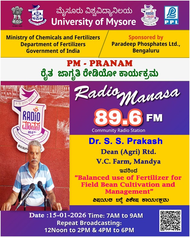 ರೇಡಿಯೋ ಮಾನಸ 89.6 FM ಮೈಸೂರು ವಿಶ್ವವಿದ್ಯಾನಿಲಯ ಮತ್ತು ರಾಸಾಯನಿಕಗಳು ಮತ್ತು ರಸಗೊಬ್ಬರಗಳ ಸಚಿವಾಲಯ ರಸಗೊಬ್ಬರಗಳ ಇಲಾಖೆ ಭಾರತ ಸರ್ಕಾರ ಇವರು ಪ್ರಾಯೋಜಿಸಲ್ಪಟ್ಟಿರುವ ಪಾರದೀಪ್ ಪಾಸ್ಪೇಟ್ಸ್ ಲಿಮಿಟೆಡ್ ಬೆಂಗಳೂರು ಇವರೊಂದಿಗೆ ಜಂಟಿಯಾಗಿ ಆಯೋಜಿಸಿರುವ ವಿಶೇಷ ಸರಣಿ ಕಾರ್ಯಕ್ರಮದಲ್ಲಿ Dr. S. S. Prakash, Dean (Agri) Rtd, V.C. farm, Mandya ಇವರು " Balanced use of fertilisers for Field Bean Cultivation and Management " ವಿಶೇಷ ಕಾರ್ಯಕ್ರಮವು ನಮ್ಮ ರೇಡಿಯೋ ಮಾನಸ CRS 89.6 FM App ಹಾಗೂ 89.6 FM ಕಂಪನಾಂಕದಲ್ಲಿ ದಿನಾಂಕ:15/01/2026ರಂದು ಬೆಳಿಗ್ಗೆ 7 ಗಂಟೆಗೆ ಪ್ರಸಾರವಾಗುತ್ತಿದ್ದು, ಎಲ್ಲಾರು ಸಹ ಕೇಳಬಹುದಾಗಿದೆ. ಇದೇ ಕಾರ್ಯಕ್ರಮವು ಮಧ್ಯಾಹ್ನ 12 ಗಂಟೆಗೆ ಮತ್ತು ಸಂಜೆ 4ಗಂಟೆಗೆ ಮರು ಪ್ರಸಾರವಾಗುತ್ತದೆ. Radio Manasa CRS 89.6 FM App Google Play Store ನಲ್ಲಿ ಲಭ್ಯವಿದ್ದು. ಎಲ್ಲರು Download ಮಾಡ ಬಹುದಾಗಿದೆ. ಅಥವಾ ಈ ಕೆಳಗಿರುವ ಲಿಂಕ್ ಅನ್ನ ಒತ್ತಿ ರೇಡಿಯೋ ಮಾನಸ App ಅನ್ನು Download ಮಾಡಿ ಕೊಂಡು ವಿಶ್ವದಾದ್ಯಂತ ಎಲ್ಲರು ಸಹ ಕೇಳಬಹುದು. https://play.google.com/store/apps/details?id=com.manasa ಪ್ರತಿ ದಿನ ನಮ್ಮ ಮೈಸೂರು ವಿಶ್ವವಿದ್ಯಾನಿಲಯ ಪ್ರಸ್ತುತ ಪಡಿಸುವ ರೇಡಿಯೋ ಮಾನಸದ ಕಾರ್ಯಕ್ರಮವು ಈ ಕೆಳಕಂಡ ಸಮಯದಲ್ಲಿ ಪ್ರಸಾರವಾಗುತ್ತದೆ 7AM to 9AM, 12Noon to 2PM, 4PM to 6 PM.