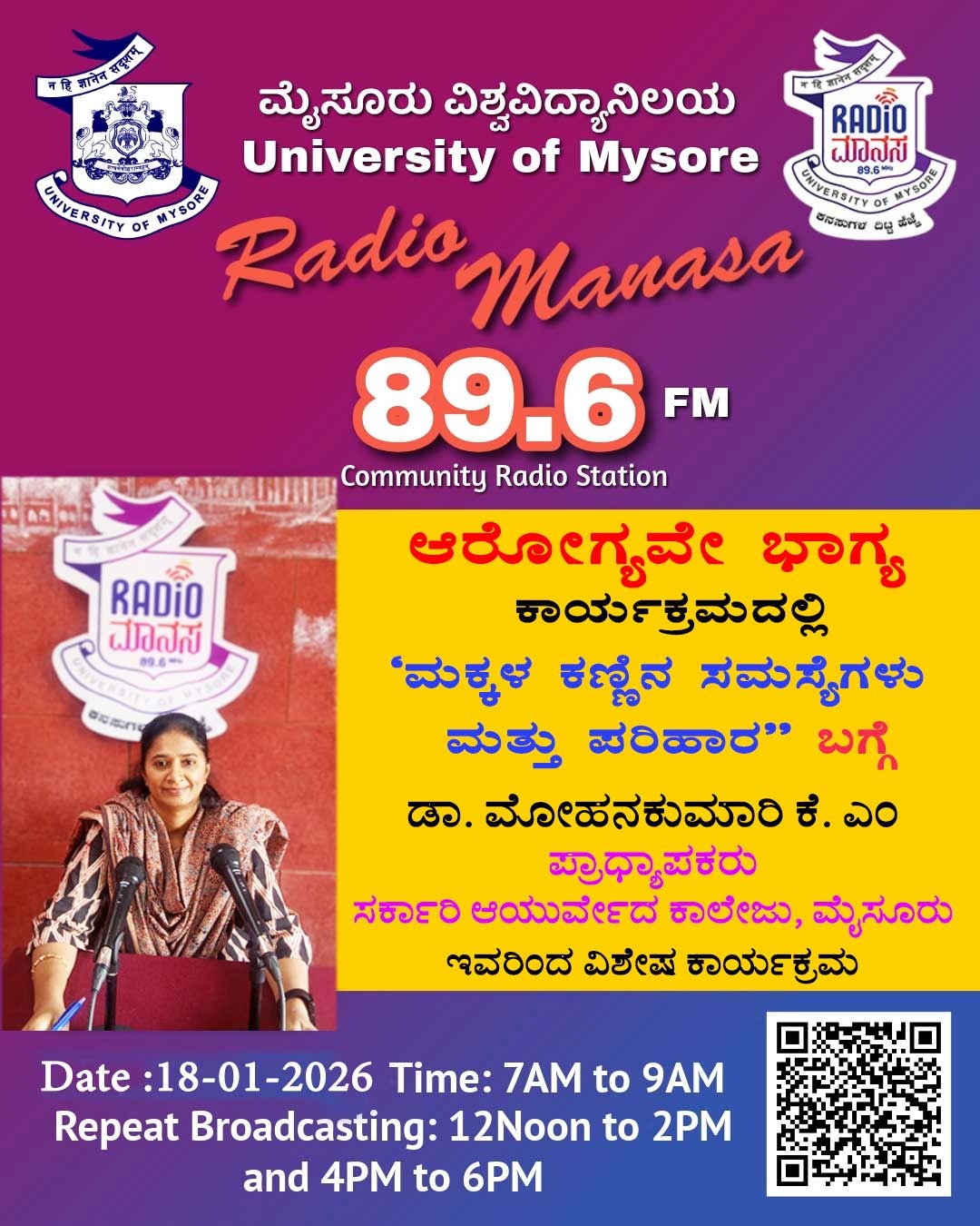 ಡಾ. ಮೋಹನಕುಮಾರಿ ಕೆ. ಎಂ ಪ್ರಾಧ್ಯಾಪಕರು, ಸರ್ಕಾರಿ ಆಯುರ್ವೇದ ಕಾಲೇಜು, ಮೈಸೂರು ಇವರು ಆರೋಗ್ಯವೇ ಭಾಗ್ಯ ವಿಶೇಷ ಕಾರ್ಯಕ್ರಮದಲ್ಲಿ " ಮಕ್ಕಳ ಕಣ್ಣಿನ ಸಮಸ್ಯೆಗಳು ಮತ್ತು ಪರಿಹಾರ " ಬಗ್ಗೆ ಉಪನ್ಯಾಸ ಕಾರ್ಯಕ್ರಮ ನಮ್ಮ ರೇಡಿಯೋ ಮಾನಸ CRS 89.6 FM App ಹಾಗೂ 89.6 FM ಕಂಪನಾಂಕದಲ್ಲಿ ದಿನಾಂಕ:18/01/2026ರಂದು ಈ ಕಾರ್ಯಕ್ರಮವು ಬೆಳಿಗ್ಗೆ 7 ಗಂಟೆಗೆ ಪ್ರಸಾರವಾಗುತ್ತಿದ್ದು, ಎಲ್ಲಾರು ಸಹ ಕೇಳಬಹುದಾಗಿದೆ. ಇದೇ ಕಾರ್ಯಕ್ರಮವು ಮಧ್ಯಾಹ್ನ 12 ಗಂಟೆಗೆ ಮತ್ತು ಸಂಜೆ 4ಗಂಟೆಗೆ ಮರು ಪ್ರಸಾರವಾಗುತ್ತದೆ. Radio Manasa CRS 89.6 FM App Google Play Store ನಲ್ಲಿ ಲಭ್ಯವಿದ್ದು. ಎಲ್ಲರು Download ಮಾಡ ಬಹುದಾಗಿದೆ. ಅಥವಾ ಈ ಕೆಳಗಿರುವ ಲಿಂಕ್ ಅನ್ನು ಒತ್ತಿ ರೇಡಿಯೋ ಮಾನಸ App ಅನ್ನು Download ಮಾಡಿ ಕೊಂಡು ವಿಶ್ವದಾದ್ಯಂತ ಎಲ್ಲರು ಸಹ ಕೇಳಬಹುದು. https://play.google.com/store/apps/details?id=com.manasa ಪ್ರತಿ ದಿನ ನಮ್ಮ ಮೈಸೂರು ವಿಶ್ವವಿದ್ಯಾನಿಲಯ ಪ್ರಸ್ತುತ ಪಡಿಸುವ ರೇಡಿಯೋ ಮಾನಸದ ಕಾರ್ಯಕ್ರಮವು ಈ ಕೆಳಕಂಡ ಸಮಯದಲ್ಲಿ ಪ್ರಸಾರವಾಗುತ್ತದೆ 7AM to 9AM, 12Noon to 2PM, 4PM to 6 PM.