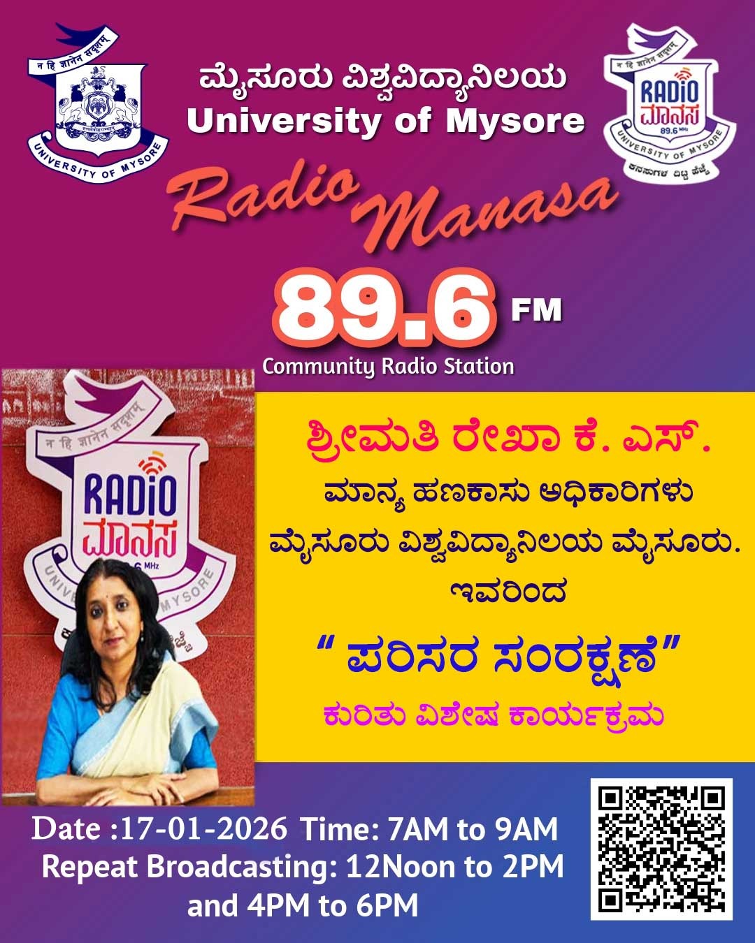 ಶ್ರೀಮತಿ. ರೇಖಾ ಕೆ.ಎಸ್. ಹಣಕಾಸು ಅಧಿಕಾರಿಗಳು, ಮೈಸೂರು ವಿಶ್ವವಿದ್ಯಾನಿಲಯ, ಮೈಸೂರು ಇವರು " ಪರಿಸರ ಸಂರಕ್ಷಣೆ" ಕುರಿತು ವಿಶೇಷ ಕಾರ್ಯಕ್ರಮ ನಮ್ಮ ರೇಡಿಯೋ ಮಾನಸ CRS 89.6 FM App ಹಾಗೂ 89.6 FM ಕಂಪನಾಂಕದಲ್ಲಿ ದಿನಾಂಕ:17/01/2026ರಂದು ಈ ಕಾರ್ಯಕ್ರಮವು ಬೆಳಿಗ್ಗೆ 7 ಗಂಟೆಗೆ ಪ್ರಸಾರವಾಗುತ್ತಿದ್ದು, ಎಲ್ಲಾರು ಸಹ ಕೇಳಬಹುದಾಗಿದೆ. ಇದೇ ಕಾರ್ಯಕ್ರಮವು ಮಧ್ಯಾಹ್ನ 12 ಗಂಟೆಗೆ ಮತ್ತು ಸಂಜೆ 4ಗಂಟೆಗೆ ಮರು ಪ್ರಸಾರವಾಗುತ್ತದೆ. Radio Manasa CRS 89.6 FM App Google Play Store ನಲ್ಲಿ ಲಭ್ಯವಿದ್ದು. ಎಲ್ಲರು Download ಮಾಡ ಬಹುದಾಗಿದೆ. ಅಥವಾ ಈ ಕೆಳಗಿರುವ ಲಿಂಕ್ ಅನ್ನು ಒತ್ತಿ ರೇಡಿಯೋ ಮಾನಸ App ಅನ್ನು Download ಮಾಡಿ ಕೊಂಡು ವಿಶ್ವದಾದ್ಯಂತ ಎಲ್ಲರು ಸಹ ಕೇಳಬಹುದು. https://play.google.com/store/apps/details?id=com.manasa ಪ್ರತಿ ದಿನ ನಮ್ಮ ಮೈಸೂರು ವಿಶ್ವವಿದ್ಯಾನಿಲಯ ಪ್ರಸ್ತುತ ಪಡಿಸುವ ರೇಡಿಯೋ ಮಾನಸದ ಕಾರ್ಯಕ್ರಮವು ಈ ಕೆಳಕಂಡ ಸಮಯದಲ್ಲಿ ಪ್ರಸಾರವಾಗುತ್ತದೆ 7AM to 9AM, 12Noon to 2PM, 4PM to 6 PM.