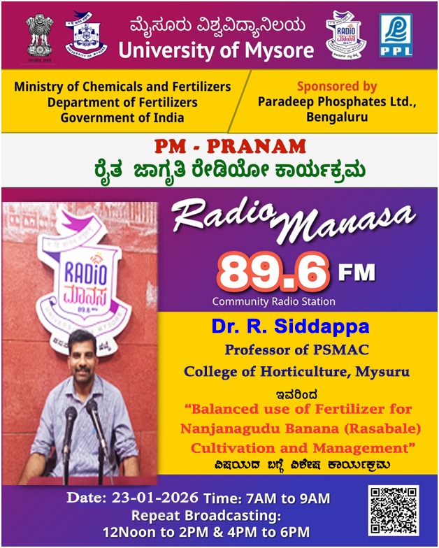 ರೇಡಿಯೋ ಮಾನಸ 89.6 FM ಮೈಸೂರು ವಿಶ್ವವಿದ್ಯಾನಿಲಯ ಮತ್ತು ರಾಸಾಯನಿಕಗಳು ಮತ್ತು ರಸಗೊಬ್ಬರಗಳ ಸಚಿವಾಲಯ ರಸಗೊಬ್ಬರಗಳ ಇಲಾಖೆ ಭಾರತ ಸರ್ಕಾರ ಇವರು ಪ್ರಾಯೋಜಿಸಲ್ಪಟ್ಟಿರುವ ಪಾರದೀಪ್ ಪಾಸ್ಪೇಟ್ಸ್ ಲಿಮಿಟೆಡ್ ಬೆಂಗಳೂರು ಇವರೊಂದಿಗೆ ಜಂಟಿಯಾಗಿ ಆಯೋಜಿಸಿರುವ ವಿಶೇಷ ಸರಣಿ ಕಾರ್ಯಕ್ರಮದಲ್ಲಿ Dr.Siddappa, Professor of PSMAC, College of Horticulture, Mysuru ಇವರು " Balance use of Fertilizer for Nanjanagudu Banana ( Rasabale) cultivation and Management " ವಿಶೇಷ ಕಾರ್ಯಕ್ರಮವು ನಮ್ಮ ರೇಡಿಯೋ ಮಾನಸ CRS 89.6 FM App ಹಾಗೂ 89.6 FM ಕಂಪನಾಂಕದಲ್ಲಿ ದಿನಾಂಕ:23/01/2026ರಂದು ಬೆಳಿಗ್ಗೆ 7 ಗಂಟೆಗೆ ಪ್ರಸಾರವಾಗುತ್ತಿದ್ದು, ಎಲ್ಲಾರು ಸಹ ಕೇಳಬಹುದಾಗಿದೆ. ಇದೇ ಕಾರ್ಯಕ್ರಮವು ಮಧ್ಯಾಹ್ನ 12 ಗಂಟೆಗೆ ಮತ್ತು ಸಂಜೆ 4ಗಂಟೆಗೆ ಮರು ಪ್ರಸಾರವಾಗುತ್ತದೆ. Radio Manasa CRS 89.6 FM App Google Play Store ನಲ್ಲಿ ಲಭ್ಯವಿದ್ದು. ಎಲ್ಲರು Download ಮಾಡ ಬಹುದಾಗಿದೆ. ಅಥವಾ ಈ ಕೆಳಗಿರುವ ಲಿಂಕ್ ಅನ್ನ ಒತ್ತಿ ರೇಡಿಯೋ ಮಾನಸ App ಅನ್ನು Download ಮಾಡಿ ಕೊಂಡು ವಿಶ್ವದಾದ್ಯಂತ ಎಲ್ಲರು ಸಹ ಕೇಳಬಹುದು. https://play.google.com/store/apps/details?id=com.manasa ಪ್ರತಿ ದಿನ ನಮ್ಮ ಮೈಸೂರು ವಿಶ್ವವಿದ್ಯಾನಿಲಯ ಪ್ರಸ್ತುತ ಪಡಿಸುವ ರೇಡಿಯೋ ಮಾನಸದ ಕಾರ್ಯಕ್ರಮವು ಈ ಕೆಳಕಂಡ ಸಮಯದಲ್ಲಿ ಪ್ರಸಾರವಾಗುತ್ತದೆ 7AM to 9AM, 12Noon to 2PM, 4PM to 6 PM.