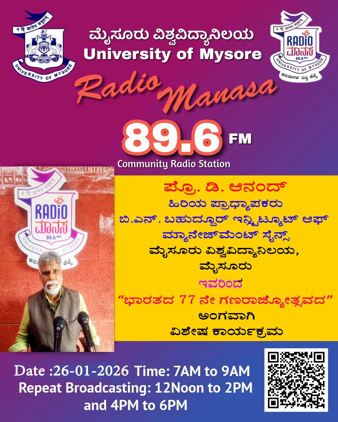ಪ್ರೊ. ಡಿ. ಆನಂದ, ಪ್ರಾಧ್ಯಾಪಕರು ಬಿ. ಎನ್.ಬಹದ್ದೂರ್ ಇನ್ಸ್ಟಿಟ್ಯೂಟ್ ಆಫ್ ಮ್ಯಾನೇಜ್ ಮೆಂಟ್ ಸೈನ್ಸ್, ಮೈಸೂರು ವಿಶ್ವವಿದ್ಯಾನಿಲಯ, ಮೈಸೂರು ಇವರಿಂದ " ಭಾರತದ 77 ನೇ ಗಣರಾಜ್ಯೋತ್ಸವದ " ಕುರಿತು ವಿಶೇಷ ಕಾರ್ಯಕ್ರಮ ನಮ್ಮ ರೇಡಿಯೋ ಮಾನಸ CRS 89.6 FM App ಹಾಗೂ 89.6 FM ಕಂಪನಾಂಕದಲ್ಲಿ ದಿನಾಂಕ:26/01/2026ರಂದು ಈ ಕಾರ್ಯಕ್ರಮವು ಬೆಳಿಗ್ಗೆ 7 ಗಂಟೆಗೆ ಪ್ರಸಾರವಾಗುತ್ತಿದ್ದು, ಎಲ್ಲಾರು ಸಹ ಕೇಳಬಹುದಾಗಿದೆ. ಇದೇ ಕಾರ್ಯಕ್ರಮವು ಮಧ್ಯಾಹ್ನ 12 ಗಂಟೆಗೆ ಮತ್ತು ಸಂಜೆ 4ಗಂಟೆಗೆ ಮರು ಪ್ರಸಾರವಾಗುತ್ತದೆ. Radio Manasa CRS 89.6 FM App Google Play Store ನಲ್ಲಿ ಲಭ್ಯವಿದ್ದು. ಎಲ್ಲರು Download ಮಾಡ ಬಹುದಾಗಿದೆ. ಅಥವಾ ಈ ಕೆಳಗಿರುವ ಲಿಂಕ್ ಅನ್ನು ಒತ್ತಿ ರೇಡಿಯೋ ಮಾನಸ App ಅನ್ನು Download ಮಾಡಿ ಕೊಂಡು ವಿಶ್ವದಾದ್ಯಂತ ಎಲ್ಲರು ಸಹ ಕೇಳಬಹುದು. https://play.google.com/store/apps/details?id=com.manasa ಪ್ರತಿ ದಿನ ನಮ್ಮ ಮೈಸೂರು ವಿಶ್ವವಿದ್ಯಾನಿಲಯ ಪ್ರಸ್ತುತ ಪಡಿಸುವ ರೇಡಿಯೋ ಮಾನಸದ ಕಾರ್ಯಕ್ರಮವು ಈ ಕೆಳಕಂಡ ಸಮಯದಲ್ಲಿ ಪ್ರಸಾರವಾಗುತ್ತದೆ 7AM to 9AM, 12Noon to 2PM, 4PM to 6 PM.