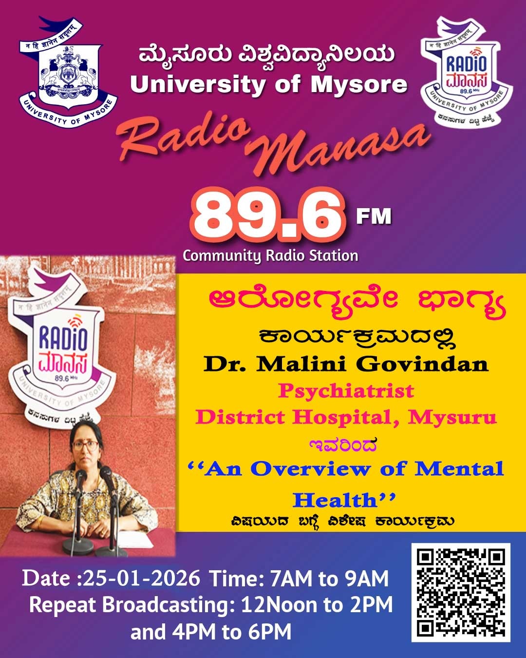 Dr. Malini Govindan, Psychiatrist, District Hospital Mysuru ಇವರು ಆರೋಗ್ಯವೇ ಭಾಗ್ಯ ವಿಶೇಷ ಕಾರ್ಯಕ್ರಮದಲ್ಲಿ "An Overview of Mental Health " ಬಗ್ಗೆ ಉಪನ್ಯಾಸ ಕಾರ್ಯಕ್ರಮ ನಮ್ಮ ರೇಡಿಯೋ ಮಾನಸ CRS 89.6 FM App ಹಾಗೂ 89.6 FM ಕಂಪನಾಂಕದಲ್ಲಿ ದಿನಾಂಕ:25/01/2026ರಂದು ಈ ಕಾರ್ಯಕ್ರಮವು ಬೆಳಿಗ್ಗೆ 7 ಗಂಟೆಗೆ ಪ್ರಸಾರವಾಗುತ್ತಿದ್ದು, ಎಲ್ಲಾರು ಸಹ ಕೇಳಬಹುದಾಗಿದೆ. ಇದೇ ಕಾರ್ಯಕ್ರಮವು ಮಧ್ಯಾಹ್ನ 12 ಗಂಟೆಗೆ ಮತ್ತು ಸಂಜೆ 4ಗಂಟೆಗೆ ಮರು ಪ್ರಸಾರವಾಗುತ್ತದೆ. Radio Manasa CRS 89.6 FM App Google Play Store ನಲ್ಲಿ ಲಭ್ಯವಿದ್ದು. ಎಲ್ಲರು Download ಮಾಡ ಬಹುದಾಗಿದೆ. ಅಥವಾ ಈ ಕೆಳಗಿರುವ ಲಿಂಕ್ ಅನ್ನು ಒತ್ತಿ ರೇಡಿಯೋ ಮಾನಸ App ಅನ್ನು Download ಮಾಡಿ ಕೊಂಡು ವಿಶ್ವದಾದ್ಯಂತ ಎಲ್ಲರು ಸಹ ಕೇಳಬಹುದು. https://play.google.com/store/apps/details?id=com.manasa ಪ್ರತಿ ದಿನ ನಮ್ಮ ಮೈಸೂರು ವಿಶ್ವವಿದ್ಯಾನಿಲಯ ಪ್ರಸ್ತುತ ಪಡಿಸುವ ರೇಡಿಯೋ ಮಾನಸದ ಕಾರ್ಯಕ್ರಮವು ಈ ಕೆಳಕಂಡ ಸಮಯದಲ್ಲಿ ಪ್ರಸಾರವಾಗುತ್ತದೆ 7AM to 9AM, 12Noon to 2PM, 4PM to 6 PM.