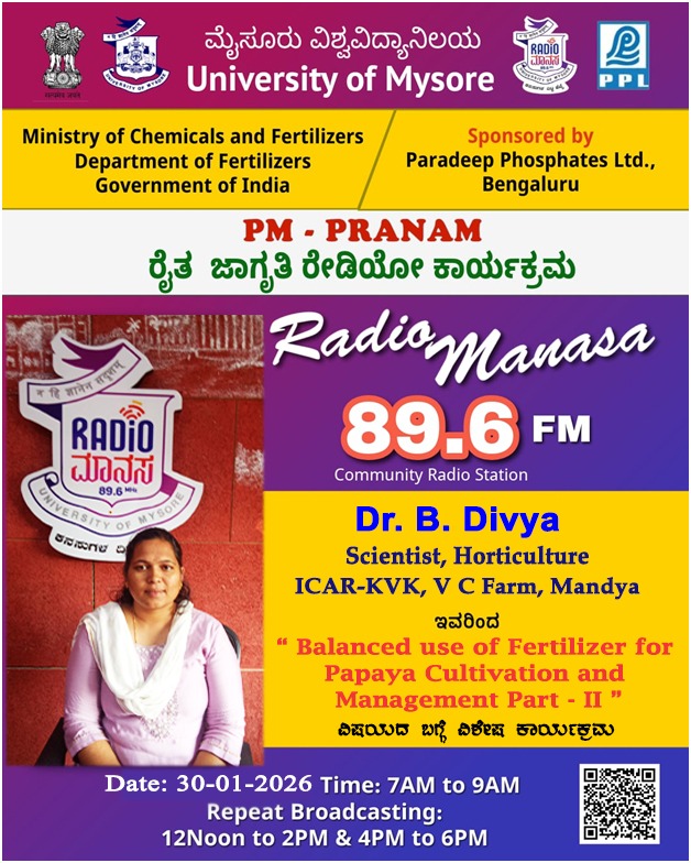 ರೇಡಿಯೋ ಮಾನಸ 89.6 FM ಮೈಸೂರು ವಿಶ್ವವಿದ್ಯಾನಿಲಯ ಮತ್ತು ರಾಸಾಯನಿಕಗಳು ಮತ್ತು ರಸಗೊಬ್ಬರಗಳ ಸಚಿವಾಲಯ ರಸಗೊಬ್ಬರಗಳ ಇಲಾಖೆ ಭಾರತ ಸರ್ಕಾರ ಇವರು ಪ್ರಾಯೋಜಿಸಲ್ಪಟ್ಟಿರುವ ಪಾರದೀಪ್ ಪಾಸ್ಪೇಟ್ಸ್ ಲಿಮಿಟೆಡ್ ಬೆಂಗಳೂರು ಇವರೊಂದಿಗೆ ಜಂಟಿಯಾಗಿ ಆಯೋಜಿಸಿರುವ ವಿಶೇಷ ಸರಣಿ ಕಾರ್ಯಕ್ರಮದಲ್ಲಿ Dr. Divya B. (Horticulture), ICAR KVK V C Farm, Mandya ಇವರು "Balanced use of Fertilizer for Papaya Cultivation and Management Part - I" ವಿಶೇಷ ಕಾರ್ಯಕ್ರಮವು ನಮ್ಮ ರೇಡಿಯೋ ಮಾನಸ CRS 89.6 FM App ಹಾಗೂ 89.6 FM ಕಂಪನಾಂಕದಲ್ಲಿ ದಿನಾಂಕ:29/01/2026 ರಂದು ಬೆಳಿಗ್ಗೆ 7 ಗಂಟೆಗೆ ಪ್ರಸಾರವಾಗುತ್ತಿದ್ದು, ಎಲ್ಲಾರು ಸಹ ಕೇಳಬಹುದಾಗಿದೆ. ಇದೇ ಕಾರ್ಯಕ್ರಮವು ಮಧ್ಯಾಹ್ನ 12 ಗಂಟೆಗೆ ಮತ್ತು ಸಂಜೆ 4 ಗಂಟೆಗೆ ಮರು ಪ್ರಸಾರವಾಗುತ್ತದೆ. Radio Manasa CRS 89.6 FM App Google Play Store ನಲ್ಲಿ ಲಭ್ಯವಿದ್ದು. ಎಲ್ಲರು Download ಮಾಡ ಬಹುದಾಗಿದೆ. ಅಥವಾ ಈ ಕೆಳಗಿರುವ ಲಿಂಕ್ ಅನ್ನ ಒತ್ತಿ ರೇಡಿಯೋ ಮಾನಸ App ಅನ್ನು Download ಮಾಡಿ ಕೊಂಡು ವಿಶ್ವದಾದ್ಯಂತ ಎಲ್ಲರು ಸಹ ಕೇಳಬಹುದು. https://play.google.com/store/apps/details?id=com.manasa ಪ್ರತಿ ದಿನ ನಮ್ಮ ಮೈಸೂರು ವಿಶ್ವವಿದ್ಯಾನಿಲಯ ಪ್ರಸ್ತುತ ಪಡಿಸುವ ರೇಡಿಯೋ ಮಾನಸದ ಕಾರ್ಯಕ್ರಮವು ಈ ಕೆಳಕಂಡ ಸಮಯದಲ್ಲಿ ಪ್ರಸಾರವಾಗುತ್ತದೆ 7AM to 9AM, 12Noon to 2PM, 4PM to 6 PM.
