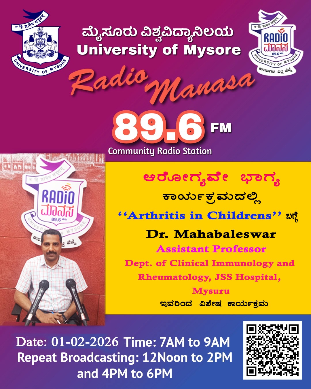 Dr. Mahabaleswar, Asst. Professor, Dept. of Clinical Immunology and Rheumatology, JSS Hospital, Mysuru ಇವರು ಆರೋಗ್ಯವೇ ಭಾಗ್ಯ ವಿಶೇಷ ಕಾರ್ಯಕ್ರಮದಲ್ಲಿ "Arthritis in Childrens" ಬಗ್ಗೆ ಉಪನ್ಯಾಸ ಕಾರ್ಯಕ್ರಮ ನಮ್ಮ ರೇಡಿಯೋ ಮಾನಸ CRS 89.6 FM App ಹಾಗೂ 89.6 FM ಕಂಪನಾಂಕದಲ್ಲಿ ದಿನಾಂಕ:01/02/2026ರಂದು ಈ ಕಾರ್ಯಕ್ರಮವು ಬೆಳಿಗ್ಗೆ 7 ಗಂಟೆಗೆ ಪ್ರಸಾರವಾಗುತ್ತಿದ್ದು, ಎಲ್ಲಾರು ಸಹ ಕೇಳಬಹುದಾಗಿದೆ. ಇದೇ ಕಾರ್ಯಕ್ರಮವು ಮಧ್ಯಾಹ್ನ 12 ಗಂಟೆಗೆ ಮತ್ತು ಸಂಜೆ 4ಗಂಟೆಗೆ ಮರು ಪ್ರಸಾರವಾಗುತ್ತದೆ. Radio Manasa CRS 89.6 FM App Google Play Store ನಲ್ಲಿ ಲಭ್ಯವಿದ್ದು. ಎಲ್ಲರು Download ಮಾಡ ಬಹುದಾಗಿದೆ. ಅಥವಾ ಈ ಕೆಳಗಿರುವ ಲಿಂಕ್ ಅನ್ನು ಒತ್ತಿ ರೇಡಿಯೋ ಮಾನಸ App ಅನ್ನು Download ಮಾಡಿ ಕೊಂಡು ವಿಶ್ವದಾದ್ಯಂತ ಎಲ್ಲರು ಸಹ ಕೇಳಬಹುದು. https://play.google.com/store/apps/details?id=com.manasa ಪ್ರತಿ ದಿನ ನಮ್ಮ ಮೈಸೂರು ವಿಶ್ವವಿದ್ಯಾನಿಲಯ ಪ್ರಸ್ತುತ ಪಡಿಸುವ ರೇಡಿಯೋ ಮಾನಸದ ಕಾರ್ಯಕ್ರಮವು ಈ ಕೆಳಕಂಡ ಸಮಯದಲ್ಲಿ ಪ್ರಸಾರವಾಗುತ್ತದೆ 7AM to 9AM, 12Noon to 2PM, 4PM to 6 PM.