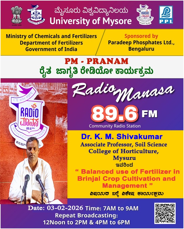 ರೇಡಿಯೋ ಮಾನಸ 89.6 FM ಮೈಸೂರು ವಿಶ್ವವಿದ್ಯಾನಿಲಯ ಮತ್ತು ರಾಸಾಯನಿಕಗಳು ಮತ್ತು ರಸಗೊಬ್ಬರಗಳ ಸಚಿವಾಲಯ ರಸಗೊಬ್ಬರಗಳ ಇಲಾಖೆ ಭಾರತ ಸರ್ಕಾರ ಇವರು ಪ್ರಾಯೋಜಿಸಲ್ಪಟ್ಟಿರುವ ಪಾರದೀಪ್ ಪಾಸ್ಪೇಟ್ಸ್ ಲಿಮಿಟೆಡ್ ಬೆಂಗಳೂರು ಇವರೊಂದಿಗೆ ಜಂಟಿಯಾಗಿ ಆಯೋಜಿಸಿರುವ ವಿಶೇಷ ಸರಣಿ ಕಾರ್ಯಕ್ರಮದಲ್ಲಿ Dr. K. M. Shivakumar, Associate Professor, Soil Science, College of Horticulture, Mysuru ಇವರು "Balanced use of Fertilizer in Brinjal Crop Cultivation and Management " ವಿಶೇಷ ಕಾರ್ಯಕ್ರಮವು ನಮ್ಮ ರೇಡಿಯೋ ಮಾನಸ CRS 89.6 FM App ಹಾಗೂ 89.6 FM ಕಂಪನಾಂಕದಲ್ಲಿ ದಿನಾಂಕ:03/02/2026 ರಂದು ಬೆಳಿಗ್ಗೆ 7 ಗಂಟೆಗೆ ಪ್ರಸಾರವಾಗುತ್ತಿದ್ದು, ಎಲ್ಲಾರು ಸಹ ಕೇಳಬಹುದಾಗಿದೆ. ಇದೇ ಕಾರ್ಯಕ್ರಮವು ಮಧ್ಯಾಹ್ನ 12 ಗಂಟೆಗೆ ಮತ್ತು ಸಂಜೆ 4 ಗಂಟೆಗೆ ಮರು ಪ್ರಸಾರವಾಗುತ್ತದೆ. Radio Manasa CRS 89.6 FM App Google Play Store ನಲ್ಲಿ ಲಭ್ಯವಿದ್ದು. ಎಲ್ಲರು Download ಮಾಡ ಬಹುದಾಗಿದೆ. ಅಥವಾ ಈ ಕೆಳಗಿರುವ ಲಿಂಕ್ ಅನ್ನ ಒತ್ತಿ ರೇಡಿಯೋ ಮಾನಸ App ಅನ್ನು Download ಮಾಡಿ ಕೊಂಡು ವಿಶ್ವದಾದ್ಯಂತ ಎಲ್ಲರು ಸಹ ಕೇಳಬಹುದು. https://play.google.com/store/apps/details?id=com.manasa ಪ್ರತಿ ದಿನ ನಮ್ಮ ಮೈಸೂರು ವಿಶ್ವವಿದ್ಯಾನಿಲಯ ಪ್ರಸ್ತುತ ಪಡಿಸುವ ರೇಡಿಯೋ ಮಾನಸದ ಕಾರ್ಯಕ್ರಮವು ಈ ಕೆಳಕಂಡ ಸಮಯದಲ್ಲಿ ಪ್ರಸಾರವಾಗುತ್ತದೆ 7AM to 9AM, 12Noon to 2PM, 4PM to 6 PM.