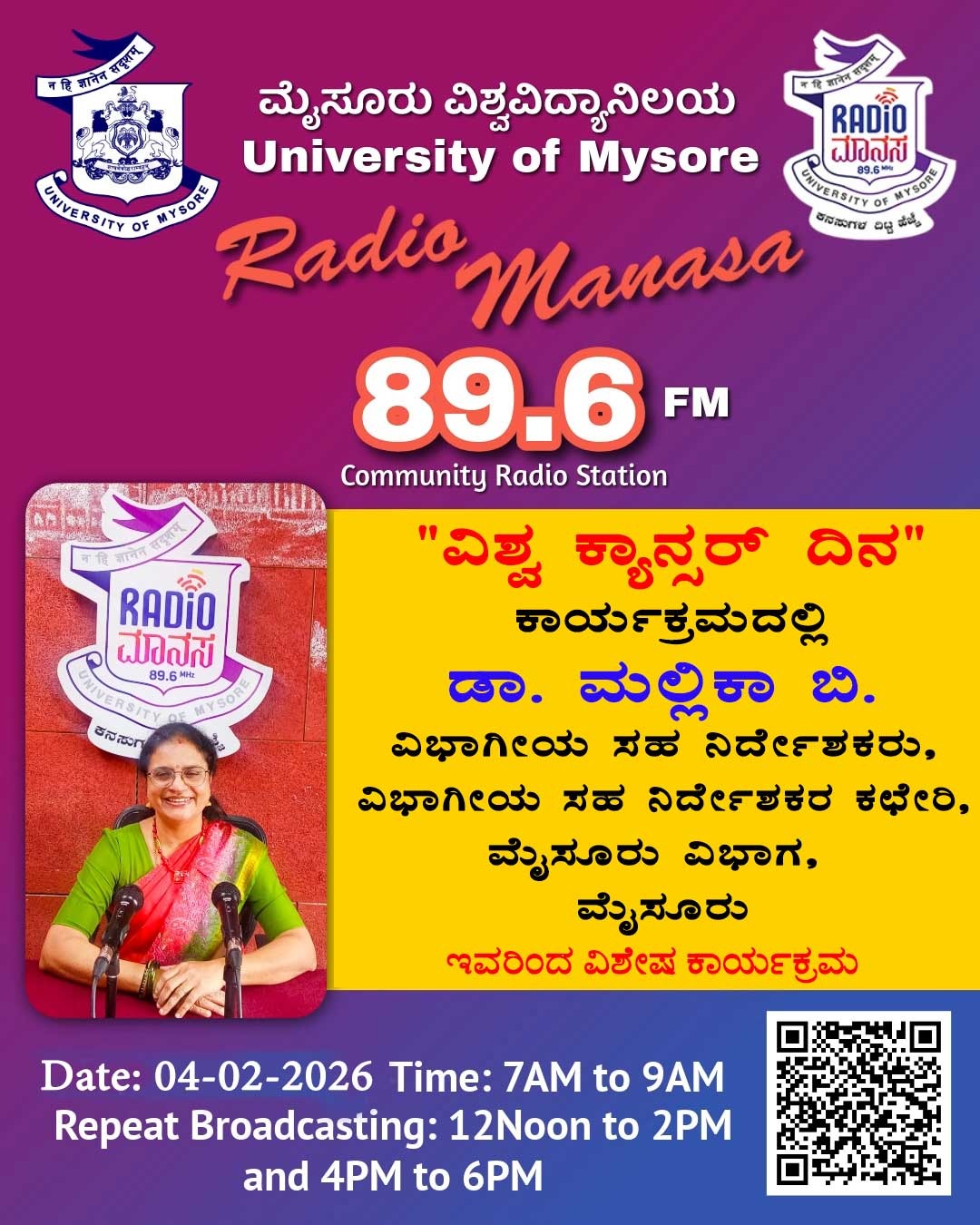 ಡಾ. ಮಲ್ಲಿಕಾ ಬಿ. ವಿಭಾಗೀಯ ಸಹ ನಿರ್ದೇಶಕರು, ವಿಭಾಗೀಯ ಸಹ ನಿರ್ದೇಶಕರ ಕಚೇರಿ, ಮೈಸೂರು ವಿಭಾಗ, ಮೈಸೂರು ಇವರು " ವಿಶ್ವ ಕ್ಯಾನ್ಸರ್ ದಿನ" ಕುರಿತು ವಿಶೇಷ ಉಪನ್ಯಾಸ ಕಾರ್ಯಕ್ರಮ ನಮ್ಮ ರೇಡಿಯೋ ಮಾನಸ CRS 89.6 FM App ಹಾಗೂ 89.6 FM ಕಂಪನಾಂಕದಲ್ಲಿ ದಿನಾಂಕ:04/02/2026 ರಂದು ಈ ಕಾರ್ಯಕ್ರಮವು ಬೆಳಿಗ್ಗೆ 7 ಗಂಟೆಗೆ ಪ್ರಸಾರವಾಗುತ್ತಿದ್ದು, ಎಲ್ಲಾರು ಸಹ ಕೇಳಬಹುದಾಗಿದೆ. ಇದೇ ಕಾರ್ಯಕ್ರಮವು ಮಧ್ಯಾಹ್ನ 12 ಗಂಟೆಗೆ ಮತ್ತು ಸಂಜೆ 4ಗಂಟೆಗೆ ಮರು ಪ್ರಸಾರವಾಗುತ್ತದೆ. Radio Manasa CRS 89.6 FM App Google Play Store ನಲ್ಲಿ ಲಭ್ಯವಿದ್ದು. ಎಲ್ಲರು Download ಮಾಡ ಬಹುದಾಗಿದೆ. ಅಥವಾ ಈ ಕೆಳಗಿರುವ ಲಿಂಕ್ ಅನ್ನು ಒತ್ತಿ ರೇಡಿಯೋ ಮಾನಸ App ಅನ್ನು Download ಮಾಡಿ ಕೊಂಡು ವಿಶ್ವದಾದ್ಯಂತ ಎಲ್ಲರು ಸಹ ಕೇಳಬಹುದು. https://play.google.com/store/apps/details?id=com.manasa ಪ್ರತಿ ದಿನ ನಮ್ಮ ಮೈಸೂರು ವಿಶ್ವವಿದ್ಯಾನಿಲಯ ಪ್ರಸ್ತುತ ಪಡಿಸುವ ರೇಡಿಯೋ ಮಾನಸದ ಕಾರ್ಯಕ್ರಮವು ಈ ಕೆಳಕಂಡ ಸಮಯದಲ್ಲಿ ಪ್ರಸಾರವಾಗುತ್ತದೆ 7AM to 9AM, 12Noon to 2PM, 4PM to 6 PM.