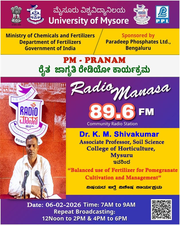 ರೇಡಿಯೋ ಮಾನಸ 89.6 FM ಮೈಸೂರು ವಿಶ್ವವಿದ್ಯಾನಿಲಯ ಮತ್ತು ರಾಸಾಯನಿಕಗಳು ಮತ್ತು ರಸಗೊಬ್ಬರಗಳ ಸಚಿವಾಲಯ ರಸಗೊಬ್ಬರಗಳ ಇಲಾಖೆ ಭಾರತ ಸರ್ಕಾರ ಇವರು ಪ್ರಾಯೋಜಿಸಲ್ಪಟ್ಟಿರುವ ಪಾರದೀಪ್ ಪಾಸ್ಪೇಟ್ಸ್ ಲಿಮಿಟೆಡ್ ಬೆಂಗಳೂರು ಇವರೊಂದಿಗೆ ಜಂಟಿಯಾಗಿ ಆಯೋಜಿಸಿರುವ ವಿಶೇಷ ಸರಣಿ ಕಾರ್ಯಕ್ರಮದಲ್ಲಿ Dr. K. M. Shivakumar, Associate Professor, Soil Science, College of Horticulture, Mysuru ಇವರು "Balanced use of Fertilizer for Pomegranate Cultivation and Management " ವಿಶೇಷ ಕಾರ್ಯಕ್ರಮವು ನಮ್ಮ ರೇಡಿಯೋ ಮಾನಸ CRS 89.6 FM App ಹಾಗೂ 89.6 FM ಕಂಪನಾಂಕದಲ್ಲಿ ದಿನಾಂಕ:06/02/2026 ರಂದು ಬೆಳಿಗ್ಗೆ 7 ಗಂಟೆಗೆ ಪ್ರಸಾರವಾಗುತ್ತಿದ್ದು, ಎಲ್ಲಾರು ಸಹ ಕೇಳಬಹುದಾಗಿದೆ. ಇದೇ ಕಾರ್ಯಕ್ರಮವು ಮಧ್ಯಾಹ್ನ 12 ಗಂಟೆಗೆ ಮತ್ತು ಸಂಜೆ 4 ಗಂಟೆಗೆ ಮರು ಪ್ರಸಾರವಾಗುತ್ತದೆ. Radio Manasa CRS 89.6 FM App Google Play Store ನಲ್ಲಿ ಲಭ್ಯವಿದ್ದು. ಎಲ್ಲರು Download ಮಾಡ ಬಹುದಾಗಿದೆ. ಅಥವಾ ಈ ಕೆಳಗಿರುವ ಲಿಂಕ್ ಅನ್ನ ಒತ್ತಿ ರೇಡಿಯೋ ಮಾನಸ App ಅನ್ನು Download ಮಾಡಿ ಕೊಂಡು ವಿಶ್ವದಾದ್ಯಂತ ಎಲ್ಲರು ಸಹ ಕೇಳಬಹುದು. https://play.google.com/store/apps/details?id=com.manasa ಪ್ರತಿ ದಿನ ನಮ್ಮ ಮೈಸೂರು ವಿಶ್ವವಿದ್ಯಾನಿಲಯ ಪ್ರಸ್ತುತ ಪಡಿಸುವ ರೇಡಿಯೋ ಮಾನಸದ ಕಾರ್ಯಕ್ರಮವು ಈ ಕೆಳಕಂಡ ಸಮಯದಲ್ಲಿ ಪ್ರಸಾರವಾಗುತ್ತದೆ 7AM to 9AM, 12Noon to 2PM, 4PM to 6 PM