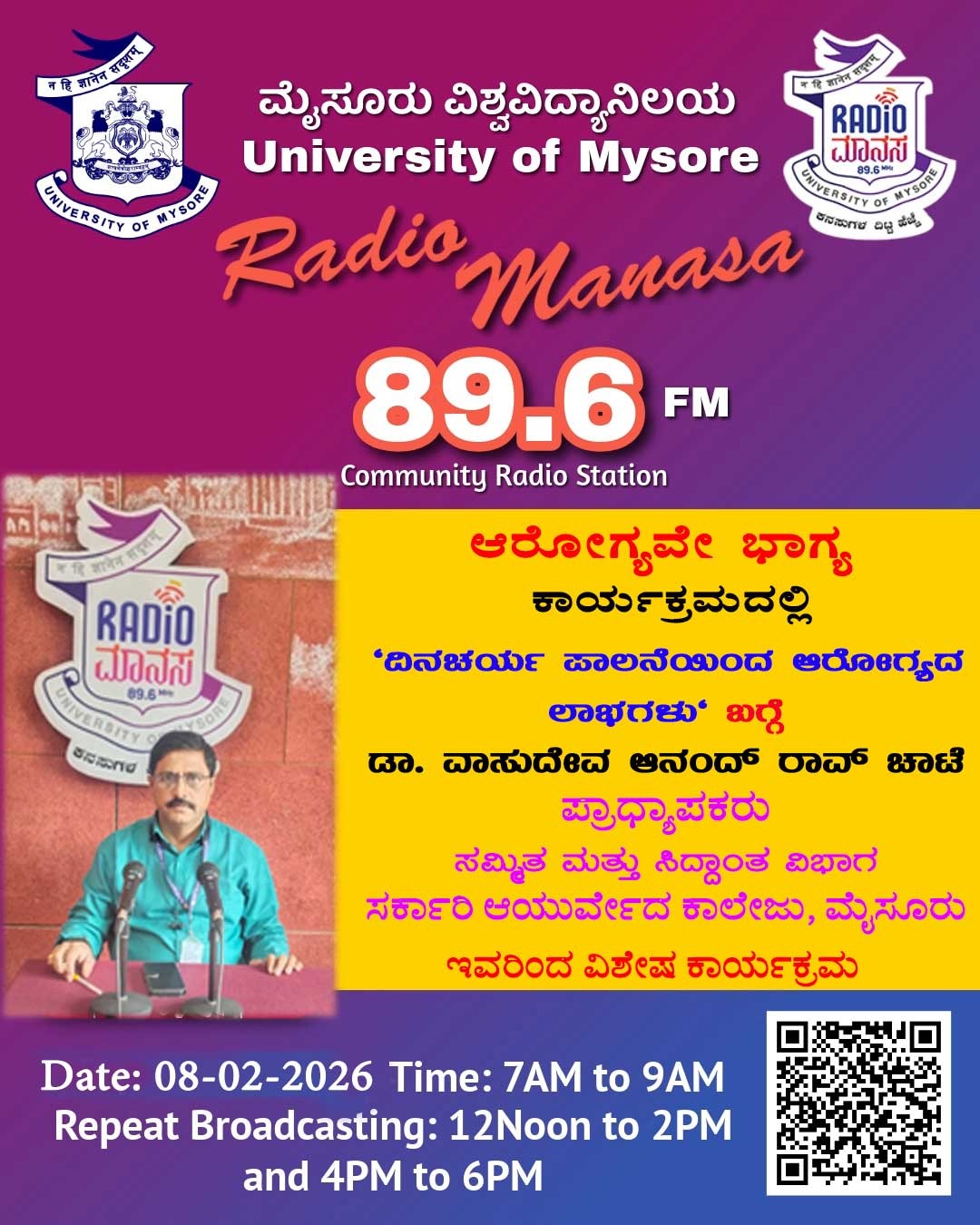 ಡಾ.ವಾಸುದೇವ ಆನಂದ್ ರಾವ್ ಚಾಟೆ, ಸಮ್ಮಿತ ಮತ್ತು ಸಿದ್ಧಾಂತ ವಿಭಾಗ ಸರ್ಕಾರಿ ಆಯುರ್ವೇದ ಕಾಲೇಜು, ಮೈಸೂರು ಇವರು ಆರೋಗ್ಯವೇ ಭಾಗ್ಯ ವಿಶೇಷ ಕಾರ್ಯಕ್ರಮದಲ್ಲಿ " ದಿನಚರ್ಯ ಪಾಲನೆಯಿಂದ ಆರೋಗ್ಯದ ಲಾಭಗಳು " ಬಗ್ಗೆ ಉಪನ್ಯಾಸ ಕಾರ್ಯಕ್ರಮ ನಮ್ಮ ರೇಡಿಯೋ ಮಾನಸ CRS 89.6 FM App ಹಾಗೂ 89.6 FM ಕಂಪನಾಂಕದಲ್ಲಿ ದಿನಾಂಕ:08/02/2026ರಂದು ಈ ಕಾರ್ಯಕ್ರಮವು ಬೆಳಿಗ್ಗೆ 7 ಗಂಟೆಗೆ ಪ್ರಸಾರವಾಗುತ್ತಿದ್ದು, ಎಲ್ಲಾರು ಸಹ ಕೇಳಬಹುದಾಗಿದೆ. ಇದೇ ಕಾರ್ಯಕ್ರಮವು ಮಧ್ಯಾಹ್ನ 12 ಗಂಟೆಗೆ ಮತ್ತು ಸಂಜೆ 4ಗಂಟೆಗೆ ಮರು ಪ್ರಸಾರವಾಗುತ್ತದೆ. Radio Manasa CRS 89.6 FM App Google Play Store ನಲ್ಲಿ ಲಭ್ಯವಿದ್ದು. ಎಲ್ಲರು Download ಮಾಡ ಬಹುದಾಗಿದೆ. ಅಥವಾ ಈ ಕೆಳಗಿರುವ ಲಿಂಕ್ ಅನ್ನು ಒತ್ತಿ ರೇಡಿಯೋ ಮಾನಸ App ಅನ್ನು Download ಮಾಡಿ ಕೊಂಡು ವಿಶ್ವದಾದ್ಯಂತ ಎಲ್ಲರು ಸಹ ಕೇಳಬಹುದು. https://play.google.com/store/apps/details?id=com.manasa ಪ್ರತಿ ದಿನ ನಮ್ಮ ಮೈಸೂರು ವಿಶ್ವವಿದ್ಯಾನಿಲಯ ಪ್ರಸ್ತುತ ಪಡಿಸುವ ರೇಡಿಯೋ ಮಾನಸದ ಕಾರ್ಯಕ್ರಮವು ಈ ಕೆಳಕಂಡ ಸಮಯದಲ್ಲಿ ಪ್ರಸಾರವಾಗುತ್ತದೆ 7AM to 9AM, 12Noon to 2PM, 4PM to 6 PM.