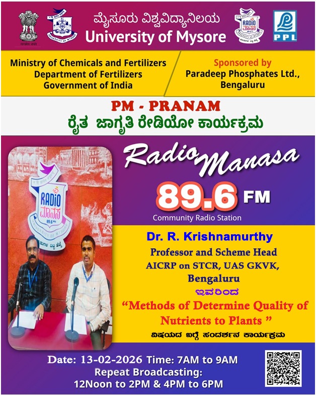 ರೇಡಿಯೋ ಮಾನಸ 89.6 FM ಮೈಸೂರು ವಿಶ್ವವಿದ್ಯಾನಿಲಯ ಮತ್ತು ರಾಸಾಯನಿಕಗಳು ಮತ್ತು ರಸಗೊಬ್ಬರಗಳ ಸಚಿವಾಲಯ ರಸಗೊಬ್ಬರಗಳ ಇಲಾಖೆ ಭಾರತ ಸರ್ಕಾರ ಇವರು ಪ್ರಾಯೋಜಿಸಲ್ಪಟ್ಟಿರುವ ಪಾರದೀಪ್ ಪಾಸ್ಪೇಟ್ಸ್ ಲಿಮಿಟೆಡ್ ಬೆಂಗಳೂರು ಇವರೊಂದಿಗೆ ಜಂಟಿಯಾಗಿ ಆಯೋಜಿಸಿರುವ ವಿಶೇಷ ಸರಣಿ ಕಾರ್ಯಕ್ರಮದಲ್ಲಿ Dr. R. Krishnamurthy. Professor and Scheme Head, AICRP on STCR, UAS GKVK, Bengaluru ಇವರು " Method of Determine Quality of Nutrients to Plants" ವಿಶೇಷ ಕಾರ್ಯಕ್ರಮವು ನಮ್ಮ ರೇಡಿಯೋ ಮಾನಸ CRS 89.6 FM App ಹಾಗೂ 89.6 FM ಕಂಪನಾಂಕದಲ್ಲಿ ದಿನಾಂಕ: 13/02/2026 ರಂದು ಬೆಳಿಗ್ಗೆ 7 ಗಂಟೆಗೆ ಪ್ರಸಾರವಾಗುತ್ತಿದ್ದು, ಎಲ್ಲಾರು ಸಹ ಕೇಳಬಹುದಾಗಿದೆ. ಇದೇ ಕಾರ್ಯಕ್ರಮವು ಮಧ್ಯಾಹ್ನ 12 ಗಂಟೆಗೆ ಮತ್ತು ಸಂಜೆ 4 ಗಂಟೆಗೆ ಮರು ಪ್ರಸಾರವಾಗುತ್ತದೆ. Radio Manasa CRS 89.6 FM App Google Play Store ನಲ್ಲಿ ಲಭ್ಯವಿದ್ದು. ಎಲ್ಲರು Download ಮಾಡ ಬಹುದಾಗಿದೆ. ಅಥವಾ ಈ ಕೆಳಗಿರುವ ಲಿಂಕ್ ಅನ್ನ ಒತ್ತಿ ರೇಡಿಯೋ ಮಾನಸ App ಅನ್ನು Download ಮಾಡಿ ಕೊಂಡು ವಿಶ್ವದಾದ್ಯಂತ ಎಲ್ಲರು ಸಹ ಕೇಳಬಹುದು. https://play.google.com/store/apps/details?id=com.manasa ಪ್ರತಿ ದಿನ ನಮ್ಮ ಮೈಸೂರು ವಿಶ್ವವಿದ್ಯಾನಿಲಯ ಪ್ರಸ್ತುತ ಪಡಿಸುವ ರೇಡಿಯೋ ಮಾನಸದ ಕಾರ್ಯಕ್ರಮವು ಈ ಕೆಳಕಂಡ ಸಮಯದಲ್ಲಿ ಪ್ರಸಾರವಾಗುತ್ತದೆ 7AM to 9AM, 12Noon to 2PM, 4PM to 6 PM