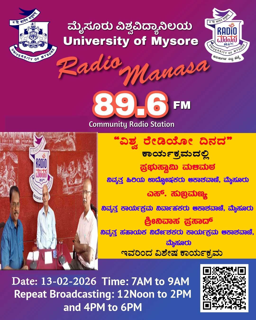 ಪ್ರಭುಸ್ವಾಮಿ ಮಳಿಮಠ್, ನಿವೃತ್ತ ಹಿರಿಯ ಉದ್ಘೋಷಕರು ಆಕಾಶವಾಣಿ, ಮೈಸೂರು, ಎಸ್. ಸುಬ್ರಹ್ಮಣ್ಯ, ನಿವೃತ್ತ ಕಾರ್ಯಕ್ರಮ ನಿರ್ವಾಹಕರು ಆಕಾಶವಾಣಿ, ಮೈಸೂರು ಮತ್ತು ಶ್ರೀನಿವಾಸ್ ಪ್ರಸಾದ್, ನಿವೃತ್ತ ಸಹಾಯಕ ನಿರ್ದೇಶಕರು ಕಾರ್ಯಕ್ರಮ ಆಕಾಶವಾಣಿ, ಮೈಸೂರು ಇವರು " ವಿಶ್ವ ರೇಡಿಯೋ ದಿನದ " ಕುರಿತು ವಿಶೇಷ ಕಾರ್ಯಕ್ರಮ ನಮ್ಮ ರೇಡಿಯೋ ಮಾನಸ CRS 89.6 FM App ಹಾಗೂ 89.6 FM ಕಂಪನಾಂಕದಲ್ಲಿ ದಿನಾಂಕ:13/02/2026ರಂದು ಈ ಕಾರ್ಯಕ್ರಮವು ಬೆಳಿಗ್ಗೆ 7 ಗಂಟೆಗೆ ಪ್ರಸಾರವಾಗುತ್ತಿದ್ದು, ಎಲ್ಲಾರು ಸಹ ಕೇಳಬಹುದಾಗಿದೆ. ಇದೇ ಕಾರ್ಯಕ್ರಮವು ಮಧ್ಯಾಹ್ನ 12 ಗಂಟೆಗೆ ಮತ್ತು ಸಂಜೆ 4ಗಂಟೆಗೆ ಮರು ಪ್ರಸಾರವಾಗುತ್ತದೆ. Radio Manasa CRS 89.6 FM App Google Play Store ನಲ್ಲಿ ಲಭ್ಯವಿದ್ದು. ಎಲ್ಲರು Download ಮಾಡ ಬಹುದಾಗಿದೆ. ಅಥವಾ ಈ ಕೆಳಗಿರುವ ಲಿಂಕ್ ಅನ್ನು ಒತ್ತಿ ರೇಡಿಯೋ ಮಾನಸ App ಅನ್ನು Download ಮಾಡಿ ಕೊಂಡು ವಿಶ್ವದಾದ್ಯಂತ ಎಲ್ಲರು ಸಹ ಕೇಳಬಹುದು. https://play.google.com/store/apps/details?id=com.manasa ಪ್ರತಿ ದಿನ ನಮ್ಮ ಮೈಸೂರು ವಿಶ್ವವಿದ್ಯಾನಿಲಯ ಪ್ರಸ್ತುತ ಪಡಿಸುವ ರೇಡಿಯೋ ಮಾನಸದ ಕಾರ್ಯಕ್ರಮವು ಈ ಕೆಳಕಂಡ ಸಮಯದಲ್ಲಿ ಪ್ರಸಾರವಾಗುತ್ತದೆ 7AM to 9AM, 12Noon to 2PM, 4PM to 6 PM.