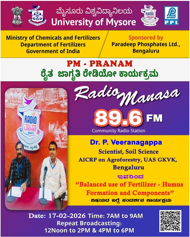ರೇಡಿಯೋ ಮಾನಸ 89.6 FM ಮೈಸೂರು ವಿಶ್ವವಿದ್ಯಾನಿಲಯ ಮತ್ತು ರಾಸಾಯನಿಕಗಳು ಮತ್ತು ರಸಗೊಬ್ಬರಗಳ ಸಚಿವಾಲಯ ರಸಗೊಬ್ಬರಗಳ ಇಲಾಖೆ ಭಾರತ ಸರ್ಕಾರ ಇವರು ಪ್ರಾಯೋಜಿಸಲ್ಪಟ್ಟಿರುವ ಪಾರದೀಪ್ ಪಾಸ್ಪೇಟ್ಸ್ ಲಿಮಿಟೆಡ್ ಬೆಂಗಳೂರು ಇವರೊಂದಿಗೆ ಜಂಟಿಯಾಗಿ ಆಯೋಜಿಸಿರುವ ವಿಶೇಷ ಸರಣಿ ಕಾರ್ಯಕ್ರಮದಲ್ಲಿ Dr.P. Veeranagappa. Scientist, Soil Science, AICRP on Agroforestry, UAS GKVK, Bengaluru ಇವರು " Balanced use of Fertilizer - Humus Formation and Components" ವಿಶೇಷ ಕಾರ್ಯಕ್ರಮವು ನಮ್ಮ ರೇಡಿಯೋ ಮಾನಸ CRS 89.6 FM App ಹಾಗೂ 89.6 FM ಕಂಪನಾಂಕದಲ್ಲಿ ದಿನಾಂಕ: 17/02/2026 ರಂದು ಬೆಳಿಗ್ಗೆ 7 ಗಂಟೆಗೆ ಪ್ರಸಾರವಾಗುತ್ತಿದ್ದು, ಎಲ್ಲಾರು ಸಹ ಕೇಳಬಹುದಾಗಿದೆ. ಇದೇ ಕಾರ್ಯಕ್ರಮವು ಮಧ್ಯಾಹ್ನ 12 ಗಂಟೆಗೆ ಮತ್ತು ಸಂಜೆ 4 ಗಂಟೆಗೆ ಮರು ಪ್ರಸಾರವಾಗುತ್ತದೆ. Radio Manasa CRS 89.6 FM App Google Play Store ನಲ್ಲಿ ಲಭ್ಯವಿದ್ದು. ಎಲ್ಲರು Download ಮಾಡ ಬಹುದಾಗಿದೆ. ಅಥವಾ ಈ ಕೆಳಗಿರುವ ಲಿಂಕ್ ಅನ್ನ ಒತ್ತಿ ರೇಡಿಯೋ ಮಾನಸ App ಅನ್ನು Download ಮಾಡಿ ಕೊಂಡು ವಿಶ್ವದಾದ್ಯಂತ ಎಲ್ಲರು ಸಹ ಕೇಳಬಹುದು. https://play.google.com/store/apps/details?id=com.manasa ಪ್ರತಿ ದಿನ ನಮ್ಮ ಮೈಸೂರು ವಿಶ್ವವಿದ್ಯಾನಿಲಯ ಪ್ರಸ್ತುತ ಪಡಿಸುವ ರೇಡಿಯೋ ಮಾನಸದ ಕಾರ್ಯಕ್ರಮವು ಈ ಕೆಳಕಂಡ ಸಮಯದಲ್ಲಿ ಪ್ರಸಾರವಾಗುತ್ತದೆ 7AM to 9AM, 12Noon to 2PM, 4PM to 6 PM.