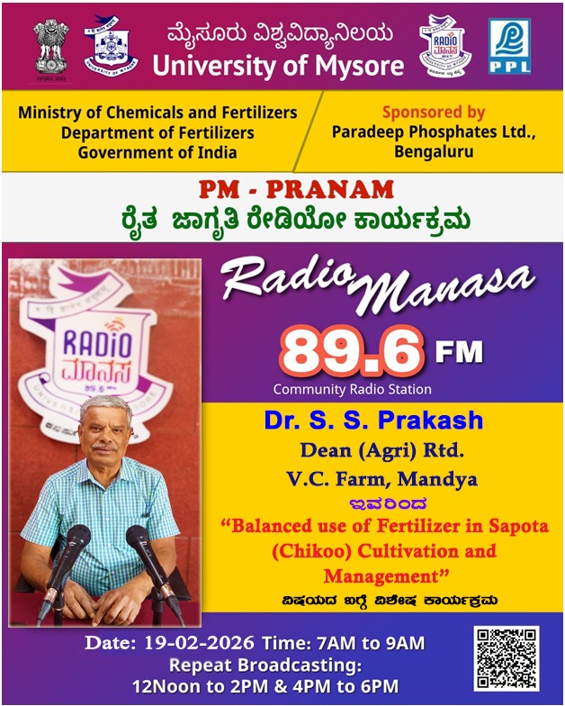 ರೇಡಿಯೋ ಮಾನಸ 89.6 FM ಮೈಸೂರು ವಿಶ್ವವಿದ್ಯಾನಿಲಯ ಮತ್ತು ರಾಸಾಯನಿಕಗಳು ಮತ್ತು ರಸಗೊಬ್ಬರಗಳ ಸಚಿವಾಲಯ ರಸಗೊಬ್ಬರಗಳ ಇಲಾಖೆ ಭಾರತ ಸರ್ಕಾರ ಇವರು ಪ್ರಾಯೋಜಿಸಲ್ಪಟ್ಟಿರುವ ಪಾರದೀಪ್ ಪಾಸ್ಪೇಟ್ಸ್ ಲಿಮಿಟೆಡ್ ಬೆಂಗಳೂರು ಇವರೊಂದಿಗೆ ಜಂಟಿಯಾಗಿ ಆಯೋಜಿಸಿರುವ ವಿಶೇಷ ಸರಣಿ ಕಾರ್ಯಕ್ರಮದಲ್ಲಿ Dr.S. S. Prakash, Dean (Agri) Rtd, V. C farm, Mandya ಇವರು " Balanced use of Fertilizer in Sapota (Chikoo) Cultivation and Management" ವಿಶೇಷ ಕಾರ್ಯಕ್ರಮವು ನಮ್ಮ ರೇಡಿಯೋ ಮಾನಸ CRS 89.6 FM App ಹಾಗೂ 89.6 FM ಕಂಪನಾಂಕದಲ್ಲಿ ದಿನಾಂಕ:19/02/2026ರಂದು ಬೆಳಿಗ್ಗೆ 7 ಗಂಟೆಗೆ ಪ್ರಸಾರವಾಗುತ್ತಿದ್ದು, ಎಲ್ಲಾರು ಸಹ ಕೇಳಬಹುದಾಗಿದೆ. ಇದೇ ಕಾರ್ಯಕ್ರಮವು ಮಧ್ಯಾಹ್ನ 12 ಗಂಟೆಗೆ ಮತ್ತು ಸಂಜೆ 4ಗಂಟೆಗೆ ಮರು ಪ್ರಸಾರವಾಗುತ್ತದೆ. Radio Manasa CRS 89.6 FM App Google Play Store ನಲ್ಲಿ ಲಭ್ಯವಿದ್ದು. ಎಲ್ಲರು Download ಮಾಡ ಬಹುದಾಗಿದೆ. ಅಥವಾ ಈ ಕೆಳಗಿರುವ ಲಿಂಕ್ ಅನ್ನ ಒತ್ತಿ ರೇಡಿಯೋ ಮಾನಸ App ಅನ್ನು Download ಮಾಡಿ ಕೊಂಡು ವಿಶ್ವದಾದ್ಯಂತ ಎಲ್ಲರು ಸಹ ಕೇಳಬಹುದು. https://play.google.com/store/apps/details?id=com.manasa ಪ್ರತಿ ದಿನ ನಮ್ಮ ಮೈಸೂರು ವಿಶ್ವವಿದ್ಯಾನಿಲಯ ಪ್ರಸ್ತುತ ಪಡಿಸುವ ರೇಡಿಯೋ ಮಾನಸದ ಕಾರ್ಯಕ್ರಮವು ಈ ಕೆಳಕಂಡ ಸಮಯದಲ್ಲಿ ಪ್ರಸಾರವಾಗುತ್ತದೆ 7AM to 9AM, 12Noon to 2PM, 4PM to 6 PM.