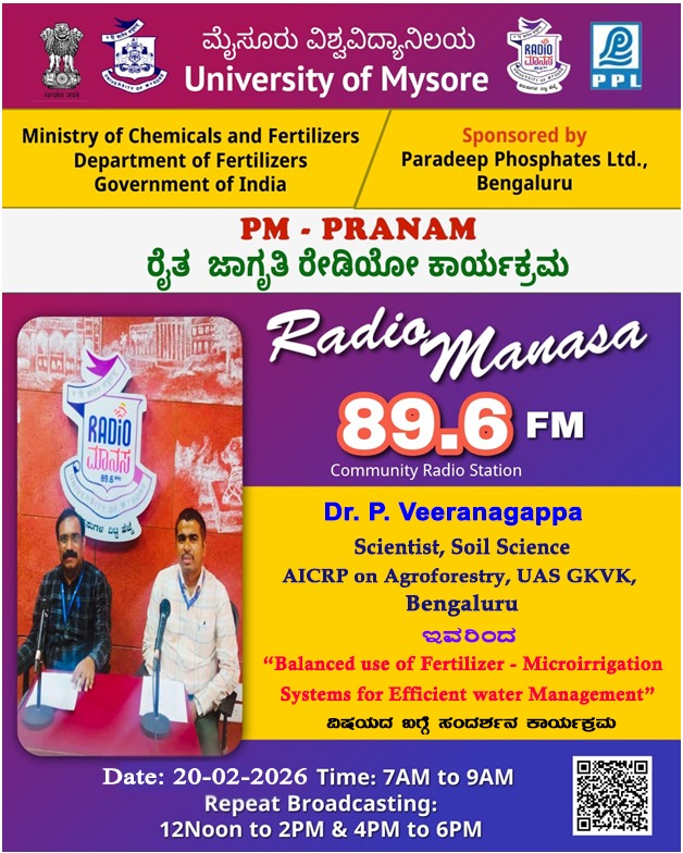 ರೇಡಿಯೋ ಮಾನಸ 89.6 FM ಮೈಸೂರು ವಿಶ್ವವಿದ್ಯಾನಿಲಯ ಮತ್ತು ರಾಸಾಯನಿಕಗಳು ಮತ್ತು ರಸಗೊಬ್ಬರಗಳ ಸಚಿವಾಲಯ ರಸಗೊಬ್ಬರಗಳ ಇಲಾಖೆ ಭಾರತ ಸರ್ಕಾರ ಇವರು ಪ್ರಾಯೋಜಿಸಲ್ಪಟ್ಟಿರುವ ಪಾರದೀಪ್ ಪಾಸ್ಪೇಟ್ಸ್ ಲಿಮಿಟೆಡ್ ಬೆಂಗಳೂರು ಇವರೊಂದಿಗೆ ಜಂಟಿಯಾಗಿ ಆಯೋಜಿಸಿರುವ ವಿಶೇಷ ಸರಣಿ ಕಾರ್ಯಕ್ರಮದಲ್ಲಿ Dr.P. Veeranagappa. Scientist, Soil Science, AICRP on Agroforestry, UAS GKVK, Bengaluru ಇವರು " Balanced use of Fertilizer - Microirrigation Systems for Efficient Water Management" ವಿಶೇಷ ಕಾರ್ಯಕ್ರಮವು ನಮ್ಮ ರೇಡಿಯೋ ಮಾನಸ CRS 89.6 FM App ಹಾಗೂ 89.6 FM ಕಂಪನಾಂಕದಲ್ಲಿ ದಿನಾಂಕ: 20/02/2026 ರಂದು ಬೆಳಿಗ್ಗೆ 7 ಗಂಟೆಗೆ ಪ್ರಸಾರವಾಗುತ್ತಿದ್ದು, ಎಲ್ಲಾರು ಸಹ ಕೇಳಬಹುದಾಗಿದೆ. ಇದೇ ಕಾರ್ಯಕ್ರಮವು ಮಧ್ಯಾಹ್ನ 12 ಗಂಟೆಗೆ ಮತ್ತು ಸಂಜೆ 4 ಗಂಟೆಗೆ ಮರು ಪ್ರಸಾರವಾಗುತ್ತದೆ. Radio Manasa CRS 89.6 FM App Google Play Store ನಲ್ಲಿ ಲಭ್ಯವಿದ್ದು. ಎಲ್ಲರು Download ಮಾಡ ಬಹುದಾಗಿದೆ. ಅಥವಾ ಈ ಕೆಳಗಿರುವ ಲಿಂಕ್ ಅನ್ನ ಒತ್ತಿ ರೇಡಿಯೋ ಮಾನಸ App ಅನ್ನು Download ಮಾಡಿ ಕೊಂಡು ವಿಶ್ವದಾದ್ಯಂತ ಎಲ್ಲರು ಸಹ ಕೇಳಬಹುದು. https://play.google.com/store/apps/details?id=com.manasa ಪ್ರತಿ ದಿನ ನಮ್ಮ ಮೈಸೂರು ವಿಶ್ವವಿದ್ಯಾನಿಲಯ ಪ್ರಸ್ತುತ ಪಡಿಸುವ ರೇಡಿಯೋ ಮಾನಸದ ಕಾರ್ಯಕ್ರಮವು ಈ ಕೆಳಕಂಡ ಸಮಯದಲ್ಲಿ ಪ್ರಸಾರವಾಗುತ್ತದೆ 7AM to 9AM, 12Noon to 2PM, 4PM to 6 PM