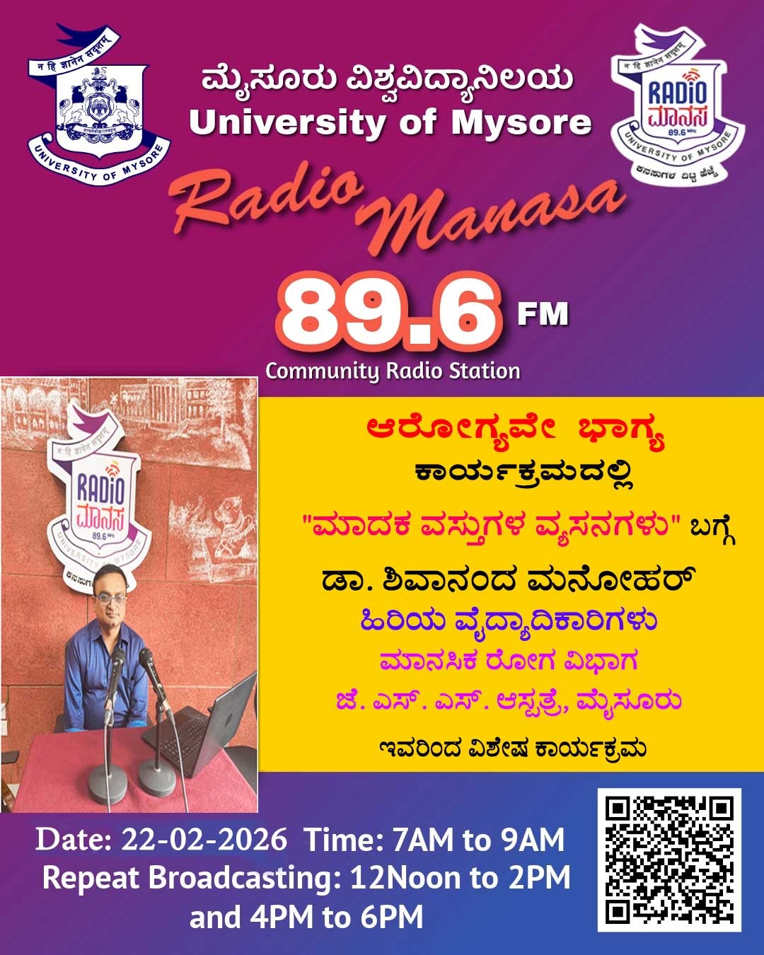 ಡಾ. ಶಿವಾನಂದ್ ಮನೋಹರ್, ಹಿರಿಯ ವೈದ್ಯಾಧಿಕಾರಿಗಳು, ಜೆಎಸ್ಎಸ್ ಆಸ್ಪತ್ರೆ, ಮೈಸೂರು ಇವರು ಆರೋಗ್ಯವೇ ಭಾಗ್ಯ ವಿಶೇಷ ಕಾರ್ಯಕ್ರಮದಲ್ಲಿ " ಮಾದಕ ವಸ್ತುಗಳ ವ್ಯಸನಗಳು" ಬಗ್ಗೆ ಉಪನ್ಯಾಸ ಕಾರ್ಯಕ್ರಮ ನಮ್ಮ ರೇಡಿಯೋ ಮಾನಸ CRS 89.6 FM App ಹಾಗೂ 89.6 FM ಕಂಪನಾಂಕದಲ್ಲಿ ದಿನಾಂಕ:22/02/2026ರಂದು ಈ ಕಾರ್ಯಕ್ರಮವು ಬೆಳಿಗ್ಗೆ 7 ಗಂಟೆಗೆ ಪ್ರಸಾರವಾಗುತ್ತಿದ್ದು, ಎಲ್ಲಾರು ಸಹ ಕೇಳಬಹುದಾಗಿದೆ. ಇದೇ ಕಾರ್ಯಕ್ರಮವು ಮಧ್ಯಾಹ್ನ 12 ಗಂಟೆಗೆ ಮತ್ತು ಸಂಜೆ 4ಗಂಟೆಗೆ ಮರು ಪ್ರಸಾರವಾಗುತ್ತದೆ. Radio Manasa CRS 89.6 FM App Google Play Store ನಲ್ಲಿ ಲಭ್ಯವಿದ್ದು. ಎಲ್ಲರು Download ಮಾಡ ಬಹುದಾಗಿದೆ. ಅಥವಾ ಈ ಕೆಳಗಿರುವ ಲಿಂಕ್ ಅನ್ನು ಒತ್ತಿ ರೇಡಿಯೋ ಮಾನಸ App ಅನ್ನು Download ಮಾಡಿ ಕೊಂಡು ವಿಶ್ವದಾದ್ಯಂತ ಎಲ್ಲರು ಸಹ ಕೇಳಬಹುದು. https://play.google.com/store/apps/details?id=com.manasa ಪ್ರತಿ ದಿನ ನಮ್ಮ ಮೈಸೂರು ವಿಶ್ವವಿದ್ಯಾನಿಲಯ ಪ್ರಸ್ತುತ ಪಡಿಸುವ ರೇಡಿಯೋ ಮಾನಸದ ಕಾರ್ಯಕ್ರಮವು ಈ ಕೆಳಕಂಡ ಸಮಯದಲ್ಲಿ ಪ್ರಸಾರವಾಗುತ್ತದೆ 7AM to 9AM, 12Noon to 2PM, 4PM to 6 PM.