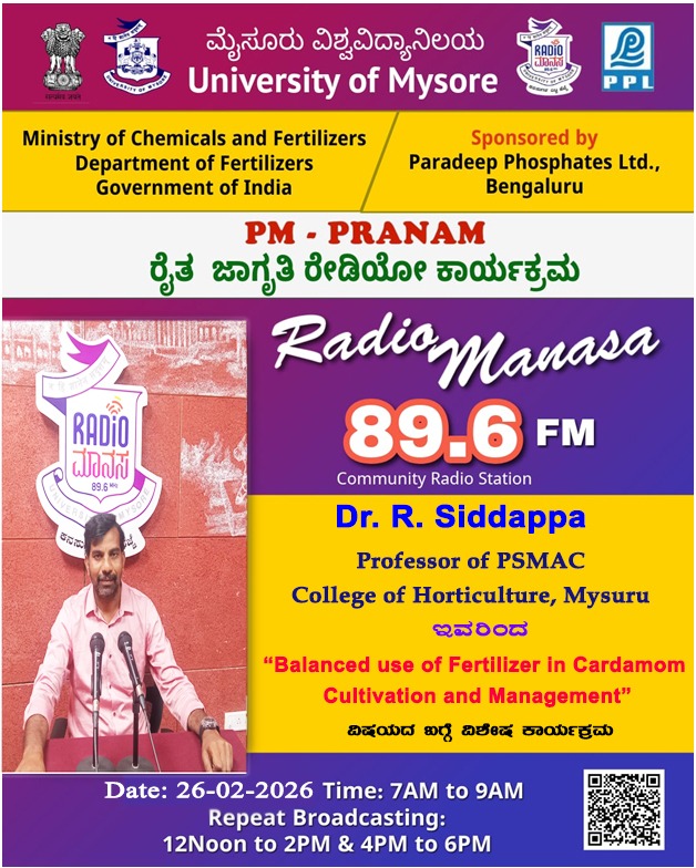 ರೇಡಿಯೋ ಮಾನಸ 89.6 FM ಮೈಸೂರು ವಿಶ್ವವಿದ್ಯಾನಿಲಯ ಮತ್ತು ರಾಸಾಯನಿಕಗಳು ಮತ್ತು ರಸಗೊಬ್ಬರಗಳ ಸಚಿವಾಲಯ ರಸಗೊಬ್ಬರಗಳ ಇಲಾಖೆ ಭಾರತ ಸರ್ಕಾರ ಇವರು ಪ್ರಾಯೋಜಿಸಲ್ಪಟ್ಟಿರುವ ಪಾರದೀಪ್ ಪಾಸ್ಪೇಟ್ಸ್ ಲಿಮಿಟೆಡ್ ಬೆಂಗಳೂರು ಇವರೊಂದಿಗೆ ಜಂಟಿಯಾಗಿ ಆಯೋಜಿಸಿರುವ ವಿಶೇಷ ಸರಣಿ ಕಾರ್ಯಕ್ರಮದಲ್ಲಿ Dr.R. Siddappa, Professor of PSMAC, College of Horticulture, Mysuru ಇವರು " Balanced use of Fertilizer in Cardamom Cultivation and Management" ವಿಶೇಷ ಕಾರ್ಯಕ್ರಮವು ನಮ್ಮ ರೇಡಿಯೋ ಮಾನಸ CRS 89.6 FM App ಹಾಗೂ 89.6 FM ಕಂಪನಾಂಕದಲ್ಲಿ ದಿನಾಂಕ: 26/02/2026 ರಂದು ಬೆಳಿಗ್ಗೆ 7 ಗಂಟೆಗೆ ಪ್ರಸಾರವಾಗುತ್ತಿದ್ದು, ಎಲ್ಲಾರು ಸಹ ಕೇಳಬಹುದಾಗಿದೆ. ಇದೇ ಕಾರ್ಯಕ್ರಮವು ಮಧ್ಯಾಹ್ನ 12 ಗಂಟೆಗೆ ಮತ್ತು ಸಂಜೆ 4 ಗಂಟೆಗೆ ಮರು ಪ್ರಸಾರವಾಗುತ್ತದೆ. Radio Manasa CRS 89.6 FM App Google Play Store ನಲ್ಲಿ ಲಭ್ಯವಿದ್ದು. ಎಲ್ಲರು Download ಮಾಡ ಬಹುದಾಗಿದೆ. ಅಥವಾ ಈ ಕೆಳಗಿರುವ ಲಿಂಕ್ ಅನ್ನ ಒತ್ತಿ ರೇಡಿಯೋ ಮಾನಸ App ಅನ್ನು Download ಮಾಡಿ ಕೊಂಡು ವಿಶ್ವದಾದ್ಯಂತ ಎಲ್ಲರು ಸಹ ಕೇಳಬಹುದು. https://play.google.com/store/apps/details?id=com.manasa ಪ್ರತಿ ದಿನ ನಮ್ಮ ಮೈಸೂರು ವಿಶ್ವವಿದ್ಯಾನಿಲಯ ಪ್ರಸ್ತುತ ಪಡಿಸುವ ರೇಡಿಯೋ ಮಾನಸದ ಕಾರ್ಯಕ್ರಮವು ಈ ಕೆಳಕಂಡ ಸಮಯದಲ್ಲಿ ಪ್ರಸಾರವಾಗುತ್ತದೆ 7AM to 9AM, 12Noon to 2PM, 4PM to 6 PM.