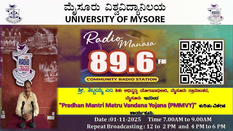 ಶ್ರೀ. ತಿಬ್ಬಯ್ಯ ಎಂ,ಜಿಲ್ಲಾ ಶಿಶು ಅಭಿವೃದ್ಧಿ ಯೋಜನಾಧಿಕಾರಿ, ಮೈಸೂರು ಗ್ರಾಮಾಂತರ, ಮೈಸೂರು, ವಿಶ್ವವಿದ್ಯಾನಿಲಯ, ಮೈಸೂರು ಇವರು " Pradhan Mantri Matru Vandana Yojana (PMMVY)" ಕುರಿತು ವಿಶೇಷ ಕಾರ್ಯಕ್ರಮ ನಮ್ಮ ರೇಡಿಯೋ ಮಾನಸ CRS 89.6 FM App ಹಾಗೂ 89.6 FM ಕಂಪನಾಂಕದಲ್ಲಿ ದಿನಾಂಕ:01/11/2025ರಂದು ಈ ಕಾರ್ಯಕ್ರಮವು ಬೆಳಿಗ್ಗೆ 7 ಗಂಟೆಗೆ ಪ್ರಸಾರವಾಗುತ್ತಿದ್ದು, ಎಲ್ಲಾರು ಸಹ ಕೇಳಬಹುದಾಗಿದೆ. ಇದೇ ಕಾರ್ಯಕ್ರಮವು ಮಧ್ಯಾಹ್ನ 12 ಗಂಟೆಗೆ ಮತ್ತು ಸಂಜೆ 4ಗಂಟೆಗೆ ಮರು ಪ್ರಸಾರವಾಗುತ್ತದೆ. Radio Manasa CRS 89.6 FM App Google Play Store ನಲ್ಲಿ ಲಭ್ಯವಿದ್ದು. ಎಲ್ಲರು Download ಮಾಡ ಬಹುದಾಗಿದೆ. ಅಥವಾ ಈ ಕೆಳಗಿರುವ ಲಿಂಕ್ ಅನ್ನು ಒತ್ತಿ ರೇಡಿಯೋ ಮಾನಸ App ಅನ್ನು Download ಮಾಡಿ ಕೊಂಡು ವಿಶ್ವದಾದ್ಯಂತ ಎಲ್ಲರು ಸಹ ಕೇಳಬಹುದು. https://play.google.com/store/apps/details?id=com.manasa ಪ್ರತಿ ದಿನ ನಮ್ಮ ಮೈಸೂರು ವಿಶ್ವವಿದ್ಯಾನಿಲಯ ಪ್ರಸ್ತುತ ಪಡಿಸುವ ರೇಡಿಯೋ ಮಾನಸದ ಕಾರ್ಯಕ್ರಮವು ಈ ಕೆಳಕಂಡ ಸಮಯದಲ್ಲಿ ಪ್ರಸಾರವಾಗುತ್ತದೆ 7AM to 9AM, 12Noon to 2PM, 4PM to 6 PM.