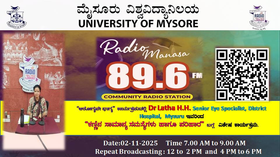 Dr. Latha H. H. Senior Eye Specialist, District, Hospital Mysuru ಇವರು ಆರೋಗ್ಯವೇ ಭಾಗ್ಯ ವಿಶೇಷ ಕಾರ್ಯಕ್ರಮದಲ್ಲಿ " ಕಣ್ಣಿನ ಸಾಮಾನ್ಯ ಸಮಸ್ಯೆಗಳು ಹಾಗೂ ಪರಿಹಾರ " ಬಗ್ಗೆ ಉಪನ್ಯಾಸ ಕಾರ್ಯಕ್ರಮ ನಮ್ಮ ರೇಡಿಯೋ ಮಾನಸ CRS 89.6 FM App ಹಾಗೂ 89.6 FM ಕಂಪನಾಂಕದಲ್ಲಿ ದಿನಾಂಕ:02/11/2025ರಂದು ಈ ಕಾರ್ಯಕ್ರಮವು ಬೆಳಿಗ್ಗೆ 7 ಗಂಟೆಗೆ ಪ್ರಸಾರವಾಗುತ್ತಿದ್ದು, ಎಲ್ಲಾರು ಸಹ ಕೇಳಬಹುದಾಗಿದೆ. ಇದೇ ಕಾರ್ಯಕ್ರಮವು ಮಧ್ಯಾಹ್ನ 12 ಗಂಟೆಗೆ ಮತ್ತು ಸಂಜೆ 4ಗಂಟೆಗೆ ಮರು ಪ್ರಸಾರವಾಗುತ್ತದೆ. Radio Manasa CRS 89.6 FM App Google Play Store ನಲ್ಲಿ ಲಭ್ಯವಿದ್ದು. ಎಲ್ಲರು Download ಮಾಡ ಬಹುದಾಗಿದೆ. ಅಥವಾ ಈ ಕೆಳಗಿರುವ ಲಿಂಕ್ ಅನ್ನು ಒತ್ತಿ ರೇಡಿಯೋ ಮಾನಸ App ಅನ್ನು Download ಮಾಡಿ ಕೊಂಡು ವಿಶ್ವದಾದ್ಯಂತ ಎಲ್ಲರು ಸಹ ಕೇಳಬಹುದು. https://play.google.com/store/apps/details?id=com.manasa ಪ್ರತಿ ದಿನ ನಮ್ಮ ಮೈಸೂರು ವಿಶ್ವವಿದ್ಯಾನಿಲಯ ಪ್ರಸ್ತುತ ಪಡಿಸುವ ರೇಡಿಯೋ ಮಾನಸದ ಕಾರ್ಯಕ್ರಮವು ಈ ಕೆಳಕಂಡ ಸಮಯದಲ್ಲಿ ಪ್ರಸಾರವಾಗುತ್ತದೆ 7AM to 9AM, 12Noon to 2PM, 4PM to 6 PM.
