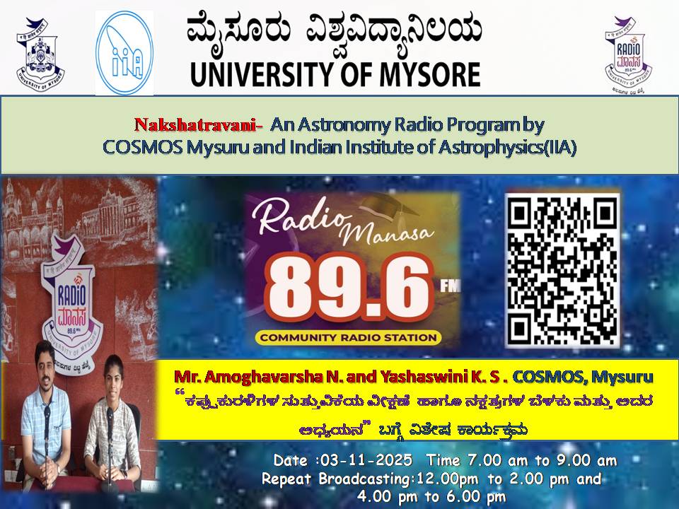 ರೇಡಿಯೋ ಮಾನಸ 89.6 FM ಮೈಸೂರು ವಿಶ್ವವಿದ್ಯಾನಿಲಯ ಮತ್ತು Nakshatravani - An Astronomy Radio Program COSMOS and Indian Institute of Astrophysics (IIA) Mysuru ಜಂಟಿಯಾಗಿ ಆಯೋಜಿಸಿರುವ ವಿಶೇಷ ಸರಣಿ ಕಾರ್ಯಕ್ರಮದಲ್ಲಿ "ಕಪ್ಪುಕುರಳಿಗಳ ಸುತ್ತುವಿಕೆಯ ವೀಕ್ಷಣೆ ಹಾಗೂ ನಕ್ಷತ್ರಗಳ ಬೆಳಕು ಮತ್ತು ಅದರ ಅಧ್ಯಯನ " ವಿಷಯದ ಬಗ್ಗೆ ಕಾರ್ಯಕ್ರಮದಲ್ಲಿ Mr. Amoghavarsha N and Yashaswini K.S, COSMOS, Mysuru ಇವರ ವಿಶೇಷ ಕಾರ್ಯಕ್ರಮವು ನಮ್ಮ ರೇಡಿಯೋ ಮಾನಸ CRS 89.6 FM App ಹಾಗೂ 89.6 FM ಕಂಪನಾಂಕದಲ್ಲಿ ದಿನಾಂಕ:03/11/2025ರಂದು ಈ ಕಾರ್ಯಕ್ರಮ ಬೆಳಿಗ್ಗೆ 7 ಗಂಟೆಗೆ ಪ್ರಸಾರವಾಗುತ್ತಿದ್ದು, ಎಲ್ಲಾರು ಸಹ ಕೇಳಬಹುದಾಗಿದೆ. ಇದೇ ಕಾರ್ಯಕ್ರಮವು ಮಧ್ಯಾಹ್ನ 12 ಗಂಟೆಗೆ ಮತ್ತು ಸಂಜೆ 4ಗಂಟೆಗೆ ಮರು ಪ್ರಸಾರವಾಗುತ್ತದೆ. Radio Manasa CRS 89.6 FM App Google Play Store ನಲ್ಲಿ ಲಭ್ಯವಿದ್ದು. ಎಲ್ಲರು Download ಮಾಡ ಬಹುದಾಗಿದೆ. ಅಥವಾ ಈ ಕೆಳಗಿರುವ ಲಿಂಕ್ ಅನ್ನು ಒತ್ತಿ ರೇಡಿಯೋ ಮಾನಸ App ಅನ್ನು Download ಮಾಡಿ ಕೊಂಡು ವಿಶ್ವದಾದ್ಯಂತ ಎಲ್ಲರು ಸಹ ಕೇಳಬಹುದು. https://play.google.com/store/apps/details?id=com.manasa ಪ್ರತಿ ದಿನ ನಮ್ಮ ಮೈಸೂರು ವಿಶ್ವವಿದ್ಯಾನಿಲಯ ಪ್ರಸ್ತುತ ಪಡಿಸುವ ರೇಡಿಯೋ ಮಾನಸದ ಕಾರ್ಯಕ್ರಮವು ಈ ಕೆಳಕಂಡ ಸಮಯದಲ್ಲಿ ಪ್ರಸಾರವಾಗುತ್ತದೆ 7AM to 9AM, 12Noon to 2PM, 4PM to 6 PM.