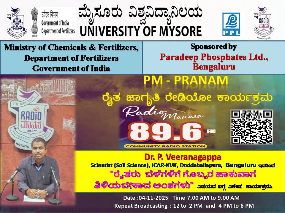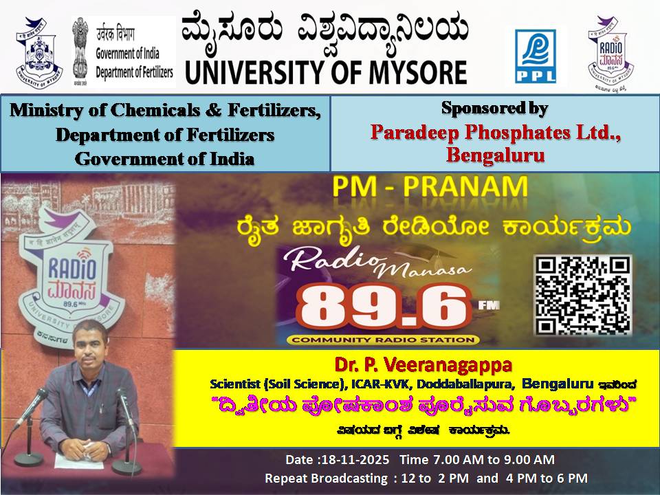 ರೇಡಿಯೋ ಮಾನಸ 89.6 FM ಮೈಸೂರು ವಿಶ್ವವಿದ್ಯಾನಿಲಯ ಮತ್ತು ರಾಸಾಯನಿಕಗಳು ಮತ್ತು ರಸಗೊಬ್ಬರಗಳ ಸಚಿವಾಲಯ ರಸಗೊಬ್ಬರಗಳ ಇಲಾಖೆ ಭಾರತ ಸರ್ಕಾರ ಇವರು ಪ್ರಾಯೋಜಿಸಲ್ಪಟ್ಟಿರುವ ಪಾರದೀಪ್ ಪಾಸ್ಪೇಟ್ಸ್ ಪ್ರೈವೇಟ್ ಲಿಮಿಟೆಡ್ ಬೆಂಗಳೂರು ಇವರೊಂದಿಗೆ ಜಂಟಿಯಾಗಿ ಆಯೋಜಿಸಿರುವ ವಿಶೇಷ ಸರಣಿ ಕಾರ್ಯಕ್ರಮದಲ್ಲಿ Dr.Veeranagappa, Scientist( Soil Science ),ICAR - KVK, Doddaballapura, Bengaluru ಇವರು " ರೈತರು ಬೆಳೆಗಳಿಗೆ ಗೊಬ್ಬರ ಹಾಕುವಾಗ ತಿಳಿಯಬೇಕಾದ ಅಂಶಗಳು " ವಿಶೇಷ ಕಾರ್ಯಕ್ರಮವು ನಮ್ಮ ರೇಡಿಯೋ ಮಾನಸ CRS 89.6 FM App ಹಾಗೂ 89.6 FM ಕಂಪನಾಂಕದಲ್ಲಿ ದಿನಾಂಕ:04/11/2025ರಂದು ಬೆಳಿಗ್ಗೆ 7 ಗಂಟೆಗೆ ಪ್ರಸಾರವಾಗುತ್ತಿದ್ದು, ಎಲ್ಲಾರು ಸಹ ಕೇಳಬಹುದಾಗಿದೆ. ಇದೇ ಕಾರ್ಯಕ್ರಮವು ಮಧ್ಯಾಹ್ನ 12 ಗಂಟೆಗೆ ಮತ್ತು ಸಂಜೆ 4ಗಂಟೆಗೆ ಮರು ಪ್ರಸಾರವಾಗುತ್ತದೆ. Radio Manasa CRS 89.6 FM App Google Play Store ನಲ್ಲಿ ಲಭ್ಯವಿದ್ದು. ಎಲ್ಲರು Download ಮಾಡ ಬಹುದಾಗಿದೆ. ಅಥವಾ ಈ ಕೆಳಗಿರುವ ಲಿಂಕ್ ಅನ್ನು ಒತ್ತಿ ರೇಡಿಯೋ ಮಾನಸ App ಅನ್ನು Download ಮಾಡಿ ಕೊಂಡು ವಿಶ್ವದಾದ್ಯಂತ ಎಲ್ಲರು ಸಹ ಕೇಳಬಹುದು. https://play.google.com/store/apps/details?id=com.manasa ಪ್ರತಿ ದಿನ ನಮ್ಮ ಮೈಸೂರು ವಿಶ್ವವಿದ್ಯಾನಿಲಯ ಪ್ರಸ್ತುತ ಪಡಿಸುವ ರೇಡಿಯೋ ಮಾನಸದ ಕಾರ್ಯಕ್ರಮವು ಈ ಕೆಳಕಂಡ ಸಮಯದಲ್ಲಿ ಪ್ರಸಾರವಾಗುತ್ತದೆ 7AM to 9AM, 12Noon to 2PM, 4PM to 6 PM