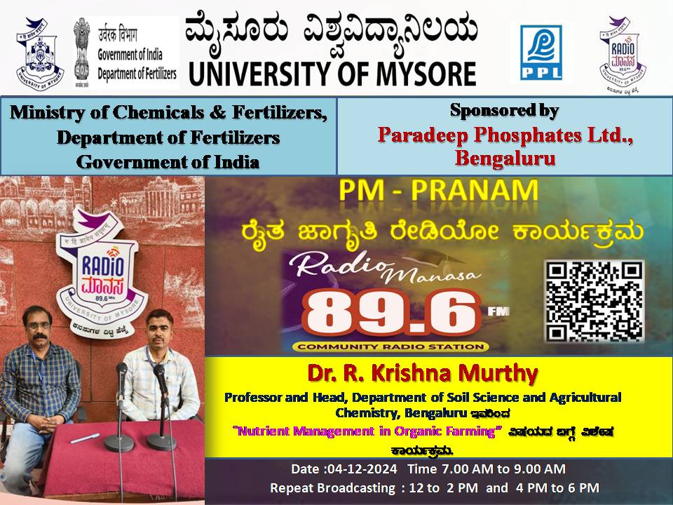 ರೇಡಿಯೋ ಮಾನಸ 89.6 FM ಮೈಸೂರು ವಿಶ್ವವಿದ್ಯಾನಿಲಯ ಮತ್ತು ರಾಸಾಯನಿಕಗಳು ಮತ್ತು ರಸಗೊಬ್ಬರಗಳ ಸಚಿವಾಲಯ ರಸಗೊಬ್ಬರಗಳ ಇಲಾಖೆ ಭಾರತ ಸರ್ಕಾರ ಇವರು ಪ್ರಾಯೋಜಿಸಲ್ಪಟ್ಟಿರುವ ಪಾರದೀಪ್ ಪಾಸ್ಪೇಟ್ಸ್ ಲಿಮಿಟೆಡ್ ಬೆಂಗಳೂರು ಇವರೊಂದಿಗೆ ಜಂಟಿಯಾಗಿ ಆಯೋಜಿಸಿರುವ ವಿಶೇಷ ಸರಣಿ ಕಾರ್ಯಕ್ರಮದಲ್ಲಿ Dr.Krishna Murthy, Professor and Head, Department of Soil Science and Agriculture Chemistry, Bengaluru ಇವರು "Nutrient Management in Organic Farming" ವಿಶೇಷ ಕಾರ್ಯಕ್ರಮವು ನಮ್ಮ ರೇಡಿಯೋ ಮಾನಸ CRS 89.6 FM App ಹಾಗೂ 89.6 FM ಕಂಪನಾಂಕದಲ್ಲಿ ದಿನಾಂಕ:04/12/2025ರಂದು ಬೆಳಿಗ್ಗೆ 7 ಗಂಟೆಗೆ ಪ್ರಸಾರವಾಗುತ್ತಿದ್ದು, ಎಲ್ಲಾರು ಸಹ ಕೇಳಬಹುದಾಗಿದೆ. ಇದೇ ಕಾರ್ಯಕ್ರಮವು ಮಧ್ಯಾಹ್ನ 12 ಗಂಟೆಗೆ ಮತ್ತು ಸಂಜೆ 4ಗಂಟೆಗೆ ಮರು ಪ್ರಸಾರವಾಗುತ್ತದೆ. Radio Manasa CRS 89.6 FM App Google Play Store ನಲ್ಲಿ ಲಭ್ಯವಿದ್ದು. ಎಲ್ಲರು Download ಮಾಡ ಬಹುದಾಗಿದೆ. ಅಥವಾ ಈ ಕೆಳಗಿರುವ ಲಿಂಕ್ ಅನ್ನ ಒತ್ತಿ ರೇಡಿಯೋ ಮಾನಸ App ಅನ್ನು Download ಮಾಡಿ ಕೊಂಡು ವಿಶ್ವದಾದ್ಯಂತ ಎಲ್ಲರು ಸಹ ಕೇಳಬಹುದು. https://play.google.com/store/apps/details?id=com.manasa ಪ್ರತಿ ದಿನ ನಮ್ಮ ಮೈಸೂರು ವಿಶ್ವವಿದ್ಯಾನಿಲಯ ಪ್ರಸ್ತುತ ಪಡಿಸುವ ರೇಡಿಯೋ ಮಾನಸದ ಕಾರ್ಯಕ್ರಮವು ಈ ಕೆಳಕಂಡ ಸಮಯದಲ್ಲಿ ಪ್ರಸಾರವಾಗುತ್ತದೆ 7AM to 9AM, 12Noon to 2PM, 4PM to 6 PM.