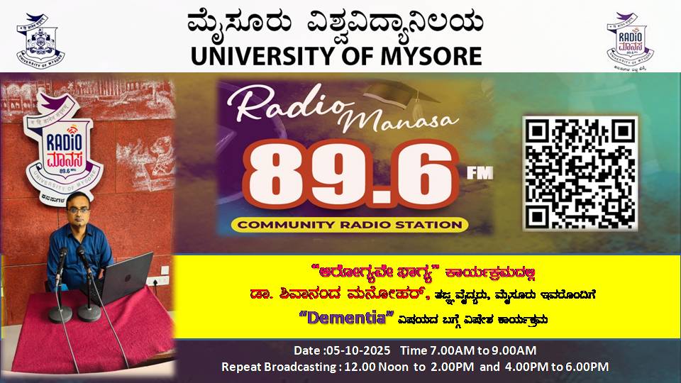 ಡಾ. ಶಿವಾನಂದ ಮನೋಹರ್, ತಜ್ಞ ವೈದ್ಯರು, ಮೈಸೂರು ಇವರು  ಆರೋಗ್ಯವೇ ಭಾಗ್ಯ ವಿಶೇಷ ಕಾರ್ಯಕ್ರಮದಲ್ಲಿ   "Dementia" ಬಗ್ಗೆ ಉಪನ್ಯಾಸ  ಕಾರ್ಯಕ್ರಮ  ನಮ್ಮ ರೇಡಿಯೋ ಮಾನಸ CRS 89.6 FM App ಹಾಗೂ 89.6 FM ಕಂಪನಾಂಕದಲ್ಲಿ ದಿನಾಂಕ:05/10/2025ರಂದು ಈ ಕಾರ್ಯಕ್ರಮವು ಬೆಳಿಗ್ಗೆ 7 ಗಂಟೆಗೆ ಪ್ರಸಾರವಾಗುತ್ತಿದ್ದು, ಎಲ್ಲಾರು ಸಹ ಕೇಳಬಹುದಾಗಿದೆ. ಇದೇ ಕಾರ್ಯಕ್ರಮವು ಮಧ್ಯಾಹ್ನ 12 ಗಂಟೆಗೆ ಮತ್ತು ಸಂಜೆ 4ಗಂಟೆಗೆ ಮರು ಪ್ರಸಾರವಾಗುತ್ತದೆ. Radio Manasa CRS 89.6 FM App Google Play Store ನಲ್ಲಿ ಲಭ್ಯವಿದ್ದು. ಎಲ್ಲರು Download ಮಾಡ ಬಹುದಾಗಿದೆ. ಅಥವಾ ಈ ಕೆಳಗಿರುವ ಲಿಂಕ್ ಅನ್ನು ಒತ್ತಿ ರೇಡಿಯೋ ಮಾನಸ App ಅನ್ನು Download ಮಾಡಿ ಕೊಂಡು ವಿಶ್ವದಾದ್ಯಂತ ಎಲ್ಲರು ಸಹ ಕೇಳಬಹುದು. https://play.google.com/store/apps/details?id=com.manasa ಪ್ರತಿ ದಿನ ನಮ್ಮ ಮೈಸೂರು ವಿಶ್ವವಿದ್ಯಾನಿಲಯ  ಪ್ರಸ್ತುತ ಪಡಿಸುವ ರೇಡಿಯೋ ಮಾನಸದ ಕಾರ್ಯಕ್ರಮವು ಈ ಕೆಳಕಂಡ ಸಮಯದಲ್ಲಿ ಪ್ರಸಾರವಾಗುತ್ತದೆ 7AM to 9AM, 12Noon to 2PM, 4PM to 6 PM.