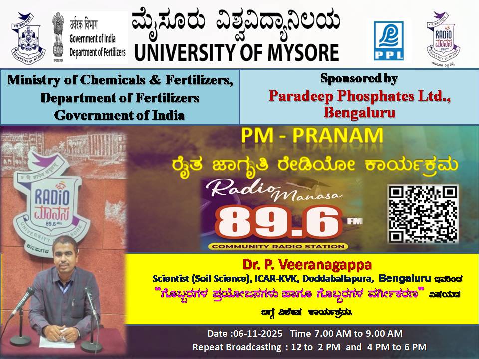 ರೇಡಿಯೋ ಮಾನಸ 89.6 FM ಮೈಸೂರು ವಿಶ್ವವಿದ್ಯಾನಿಲಯ ಮತ್ತು ರಾಸಾಯನಿಕಗಳು ಮತ್ತು ರಸಗೊಬ್ಬರಗಳ ಸಚಿವಾಲಯ ರಸಗೊಬ್ಬರಗಳ ಇಲಾಖೆ ಭಾರತ ಸರ್ಕಾರ ಇವರು ಪ್ರಾಯೋಜಿಸಲ್ಪಟ್ಟಿರುವ ಪಾರದೀಪ್ ಪಾಸ್ಪೇಟ್ಸ್ ಪ್ರೈವೇಟ್ ಲಿಮಿಟೆಡ್ ಬೆಂಗಳೂರು ಇವರೊಂದಿಗೆ ಜಂಟಿಯಾಗಿ ಆಯೋಜಿಸಿರುವ ವಿಶೇಷ ಸರಣಿ ಕಾರ್ಯಕ್ರಮದಲ್ಲಿ Dr.Veeranagappa, Scientist( Soil Science ),ICAR - KVK, Doddaballapura, Bengaluru ಇವರು " ಗೊಬ್ಬರಗಳ ಪ್ರಯೋಜನಗಳು ಹಾಗೂ ಗೊಬ್ಬರಗಳ ವರ್ಗೀಕರಣ " ವಿಶೇಷ ಕಾರ್ಯಕ್ರಮವು ನಮ್ಮ ರೇಡಿಯೋ ಮಾನಸ CRS 89.6 FM App ಹಾಗೂ 89.6 FM ಕಂಪನಾಂಕದಲ್ಲಿ ದಿನಾಂಕ:06/11/2025ರಂದು ಬೆಳಿಗ್ಗೆ 7 ಗಂಟೆಗೆ ಪ್ರಸಾರವಾಗುತ್ತಿದ್ದು, ಎಲ್ಲಾರು ಸಹ ಕೇಳಬಹುದಾಗಿದೆ. ಇದೇ ಕಾರ್ಯಕ್ರಮವು ಮಧ್ಯಾಹ್ನ 12 ಗಂಟೆಗೆ ಮತ್ತು ಸಂಜೆ 4ಗಂಟೆಗೆ ಮರು ಪ್ರಸಾರವಾಗುತ್ತದೆ. Radio Manasa CRS 89.6 FM App Google Play Store ನಲ್ಲಿ ಲಭ್ಯವಿದ್ದು. ಎಲ್ಲರು Download ಮಾಡ ಬಹುದಾಗಿದೆ. ಅಥವಾ ಈ ಕೆಳಗಿರುವ ಲಿಂಕ್ ಅನ್ನು ಒತ್ತಿ ರೇಡಿಯೋ ಮಾನಸ App ಅನ್ನು Download ಮಾಡಿ ಕೊಂಡು ವಿಶ್ವದಾದ್ಯಂತ ಎಲ್ಲರು ಸಹ ಕೇಳಬಹುದು. https://play.google.com/store/apps/details?id=com.manasa ಪ್ರತಿ ದಿನ ನಮ್ಮ ಮೈಸೂರು ವಿಶ್ವವಿದ್ಯಾನಿಲಯ ಪ್ರಸ್ತುತ ಪಡಿಸುವ ರೇಡಿಯೋ ಮಾನಸದ ಕಾರ್ಯಕ್ರಮವು ಈ ಕೆಳಕಂಡ ಸಮಯದಲ್ಲಿ ಪ್ರಸಾರವಾಗುತ್ತದೆ 7AM to 9AM, 12Noon to 2PM, 4PM to 6 PM.