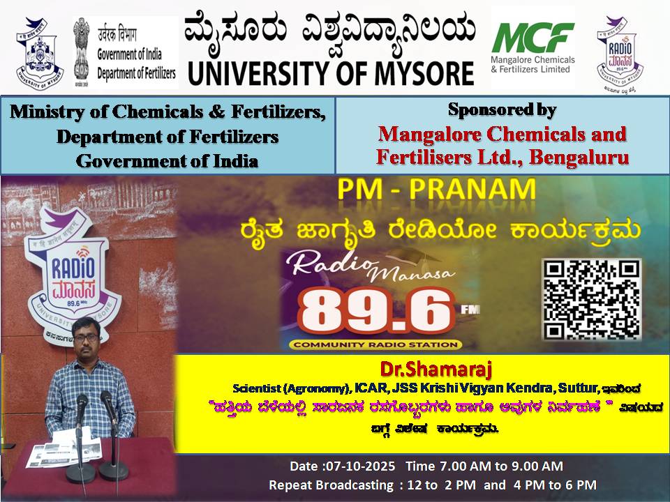 ರೇಡಿಯೋ ಮಾನಸ 89.6 FM ಮೈಸೂರು ವಿಶ್ವವಿದ್ಯಾನಿಲಯ  ಮತ್ತು  ರಾಸಾಯನಿಕಗಳು ಮತ್ತು ರಸಗೊಬ್ಬರಗಳ ಸಚಿವಾಲಯ ರಸಗೊಬ್ಬರಗಳ ಇಲಾಖೆ ಭಾರತ ಸರ್ಕಾರ ಇವರು ಪ್ರಾಯೋಜಿಸಲ್ಪಟ್ಟಿರುವ ಮಂಗಳೂರು ಕೆಮಿಕಲ್ಸ್ ಮತ್ತು ಫರ್ಟಿಲೈಸರ್ಸ್ ಪ್ರೈವೇಟ್ ಲಿಮಿಟೆಡ್ ಬೆಂಗಳೂರು  ಇವರೊಂದಿಗೆ ಜಂಟಿಯಾಗಿ ಆಯೋಜಿಸಿರುವ ವಿಶೇಷ ಸರಣಿ ಕಾರ್ಯಕ್ರಮದಲ್ಲಿ Dr. Shamaraj,  Scientist( Agronomy), ICAR JSS Krishi Vigyan Kendra, suttur   ಇವರು    "Judicious use of Fertilitzers for Sustainable Crop Productivity and Nutrients Management" ವಿಶೇಷ ಕಾರ್ಯಕ್ರಮವು  ನಮ್ಮ ರೇಡಿಯೋ ಮಾನಸ CRS 89.6 FM App ಹಾಗೂ 89.6 FM ಕಂಪನಾಂಕದಲ್ಲಿ ದಿನಾಂಕ:09/09/2025ರಂದು ಬೆಳಿಗ್ಗೆ 7 ಗಂಟೆಗೆ ಪ್ರಸಾರವಾಗುತ್ತಿದ್ದು, ಎಲ್ಲಾರು ಸಹ ಕೇಳಬಹುದಾಗಿದೆ. ಇದೇ ಕಾರ್ಯಕ್ರಮವು ಮಧ್ಯಾಹ್ನ 12 ಗಂಟೆಗೆ ಮತ್ತು ಸಂಜೆ 4ಗಂಟೆಗೆ ಮರು ಪ್ರಸಾರವಾಗುತ್ತದೆ. Radio Manasa CRS 89.6 FM App Google Play Store ನಲ್ಲಿ ಲಭ್ಯವಿದ್ದು. ಎಲ್ಲರು Download ಮಾಡ ಬಹುದಾಗಿದೆ. ಅಥವಾ ಈ ಕೆಳಗಿರುವ ಲಿಂಕ್ ಅನ್ನು ಒತ್ತಿ ರೇಡಿಯೋ ಮಾನಸ App ಅನ್ನು Download ಮಾಡಿ ಕೊಂಡು ವಿಶ್ವದಾದ್ಯಂತ ಎಲ್ಲರು ಸಹ ಕೇಳಬಹುದು. https://play.google.com/store/apps/details?id=com.manasa ಪ್ರತಿ ದಿನ ನಮ್ಮ ಮೈಸೂರು ವಿಶ್ವವಿದ್ಯಾನಿಲಯ ಪ್ರಸ್ತುತ ಪಡಿಸುವ ರೇಡಿಯೋ ಮಾನಸದ ಕಾರ್ಯಕ್ರಮವು ಈ ಕೆಳಕಂಡ ಸಮಯದಲ್ಲಿ ಪ್ರಸಾರವಾಗುತ್ತದೆ 7AM to 9AM, 12Noon to 2PM, 4PM to 6 PM.