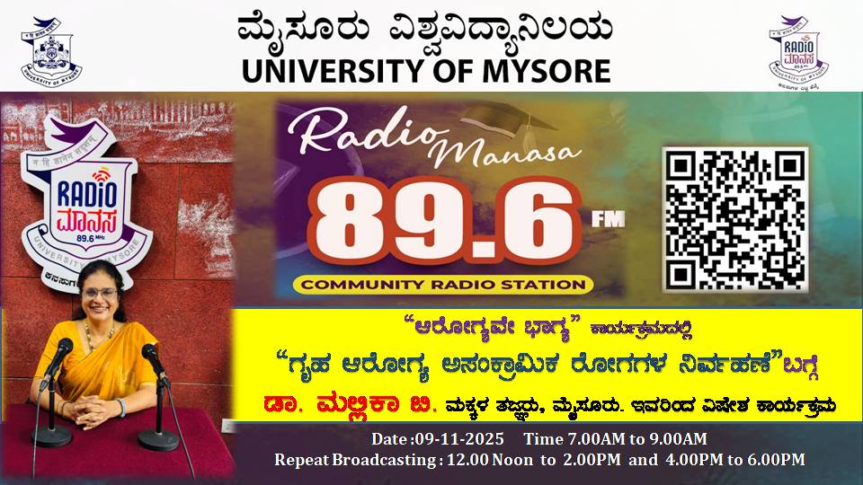 ಡಾ. ಮಲ್ಲಿಕಾ ಬಿ, ಮಕ್ಕಳ ತಜ್ಞರು ಮೈಸೂರು, ಇವರು ಆರೋಗ್ಯವೇ ಭಾಗ್ಯ ವಿಶೇಷ ಕಾರ್ಯಕ್ರಮದಲ್ಲಿ " ಗೃಹ ಆರೋಗ್ಯ ಅಸಂಕ್ರಾಮಿಕ ರೋಗಗಳ ನಿರ್ವಹಣೆ" ಬಗ್ಗೆ ಉಪನ್ಯಾಸ ಕಾರ್ಯಕ್ರಮ ನಮ್ಮ ರೇಡಿಯೋ ಮಾನಸ CRS 89.6 FM App ಹಾಗೂ 89.6 FM ಕಂಪನಾಂಕದಲ್ಲಿ ದಿನಾಂಕ:09/11/2025ರಂದು ಈ ಕಾರ್ಯಕ್ರಮವು ಬೆಳಿಗ್ಗೆ 7 ಗಂಟೆಗೆ ಪ್ರಸಾರವಾಗುತ್ತಿದ್ದು, ಎಲ್ಲಾರು ಸಹ ಕೇಳಬಹುದಾಗಿದೆ. ಇದೇ ಕಾರ್ಯಕ್ರಮವು ಮಧ್ಯಾಹ್ನ 12 ಗಂಟೆಗೆ ಮತ್ತು ಸಂಜೆ 4ಗಂಟೆಗೆ ಮರು ಪ್ರಸಾರವಾಗುತ್ತದೆ. Radio Manasa CRS 89.6 FM App Google Play Store ನಲ್ಲಿ ಲಭ್ಯವಿದ್ದು. ಎಲ್ಲರು Download ಮಾಡ ಬಹುದಾಗಿದೆ. ಅಥವಾ ಈ ಕೆಳಗಿರುವ ಲಿಂಕ್ ಅನ್ನು ಒತ್ತಿ ರೇಡಿಯೋ ಮಾನಸ App ಅನ್ನು Download ಮಾಡಿ ಕೊಂಡು ವಿಶ್ವದಾದ್ಯಂತ ಎಲ್ಲರು ಸಹ ಕೇಳಬಹುದು. https://play.google.com/store/apps/details?id=com.manasa ಪ್ರತಿ ದಿನ ನಮ್ಮ ಮೈಸೂರು ವಿಶ್ವವಿದ್ಯಾನಿಲಯ ಪ್ರಸ್ತುತ ಪಡಿಸುವ ರೇಡಿಯೋ ಮಾನಸದ ಕಾರ್ಯಕ್ರಮವು ಈ ಕೆಳಕಂಡ ಸಮಯದಲ್ಲಿ ಪ್ರಸಾರವಾಗುತ್ತದೆ 7AM to 9AM, 12Noon to 2PM, 4PM to 6 PM.