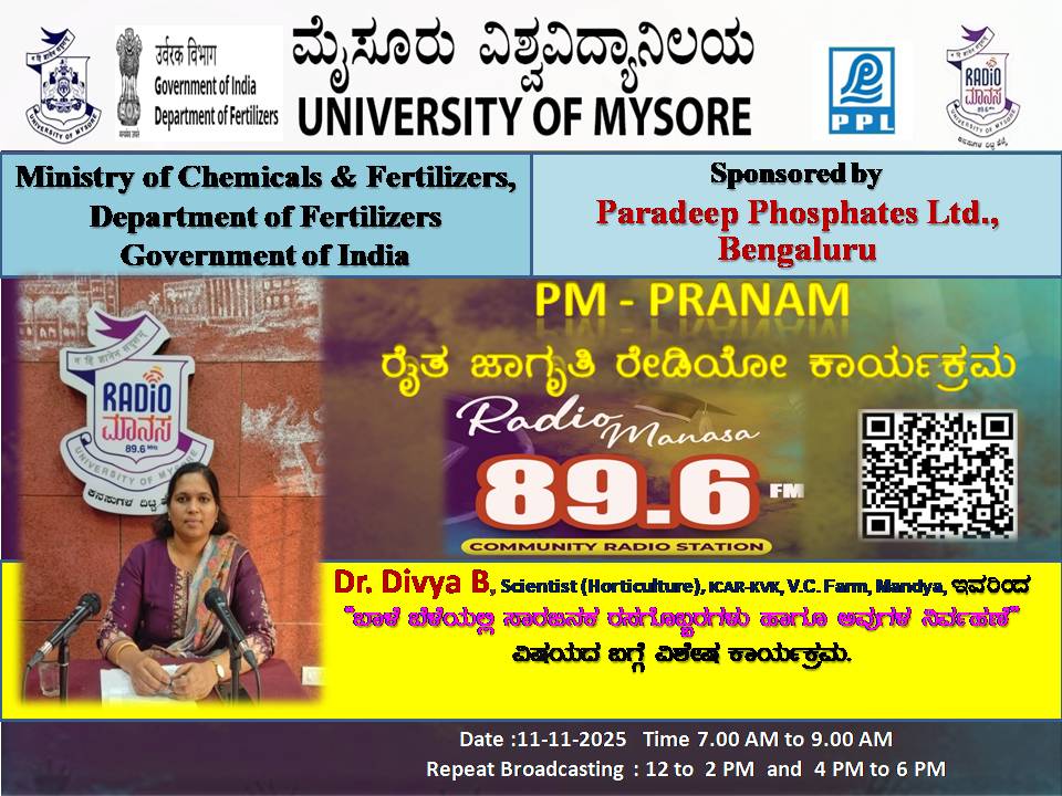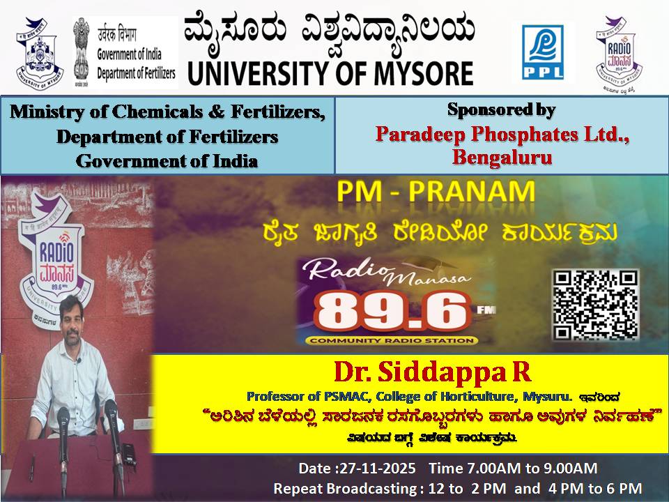 ರೇಡಿಯೋ ಮಾನಸ 89.6 FM ಮೈಸೂರು ವಿಶ್ವವಿದ್ಯಾನಿಲಯ ಮತ್ತು ರಾಸಾಯನಿಕಗಳು ಮತ್ತು ರಸಗೊಬ್ಬರಗಳ ಸಚಿವಾಲಯ ರಸಗೊಬ್ಬರಗಳ ಇಲಾಖೆ ಭಾರತ ಸರ್ಕಾರ ಇವರು ಪ್ರಾಯೋಜಿಸಲ್ಪಟ್ಟಿರುವ ಪಾರದೀಪ್ ಪಾಸ್ಪೇಟ್ಸ್ ಲಿಮಿಟೆಡ್ ಬೆಂಗಳೂರು ಇವರೊಂದಿಗೆ ಜಂಟಿಯಾಗಿ ಆಯೋಜಿಸಿರುವ ವಿಶೇಷ ಸರಣಿ ಕಾರ್ಯಕ್ರಮದಲ್ಲಿ Dr. Siddappa, Professor of PSMAC, College of Horticulture, Mysuru ಇವರು " Farmer's Challenges and their thoughts in view of Kisan Day in Rural Area " ವಿಶೇಷ ಕಾರ್ಯಕ್ರಮವು ನಮ್ಮ ರೇಡಿಯೋ ಮಾನಸ CRS 89.6 FM App ಹಾಗೂ 89.6 FM ಕಂಪನಾಂಕದಲ್ಲಿ ದಿನಾಂಕ:23/12/2025ರಂದು ಬೆಳಿಗ್ಗೆ 7 ಗಂಟೆಗೆ ಪ್ರಸಾರವಾಗುತ್ತಿದ್ದು, ಎಲ್ಲಾರು ಸಹ ಕೇಳಬಹುದಾಗಿದೆ. ಇದೇ ಕಾರ್ಯಕ್ರಮವು ಮಧ್ಯಾಹ್ನ 12 ಗಂಟೆಗೆ ಮತ್ತು ಸಂಜೆ 4ಗಂಟೆಗೆ ಮರು ಪ್ರಸಾರವಾಗುತ್ತದೆ. Radio Manasa CRS 89.6 FM App Google Play Store ನಲ್ಲಿ ಲಭ್ಯವಿದ್ದು. ಎಲ್ಲರು Download ಮಾಡ ಬಹುದಾಗಿದೆ. ಅಥವಾ ಈ ಕೆಳಗಿರುವ ಲಿಂಕ್ ಅನ್ನ ಒತ್ತಿ ರೇಡಿಯೋ ಮಾನಸ App ಅನ್ನು Download ಮಾಡಿ ಕೊಂಡು ವಿಶ್ವದಾದ್ಯಂತ ಎಲ್ಲರು ಸಹ ಕೇಳಬಹುದು. https://play.google.com/store/apps/details?id=com.manasa ಪ್ರತಿ ದಿನ ನಮ್ಮ ಮೈಸೂರು ವಿಶ್ವವಿದ್ಯಾನಿಲಯ ಪ್ರಸ್ತುತ ಪಡಿಸುವ ರೇಡಿಯೋ ಮಾನಸದ ಕಾರ್ಯಕ್ರಮವು ಈ ಕೆಳಕಂಡ ಸಮಯದಲ್ಲಿ ಪ್ರಸಾರವಾಗುತ್ತದೆ 7AM to 9AM, 12Noon to 2PM, 4PM to 6 PM.