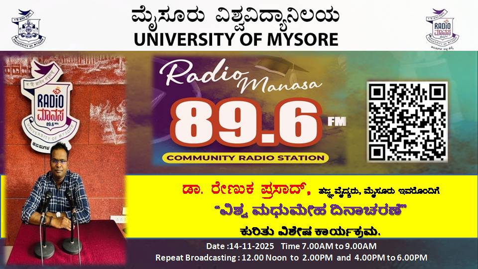 ಡಾ. ರೇಣುಕಾ ಪ್ರಸಾದ್, ತಜ್ಞ ವೈದ್ಯರು, ಮೈಸೂರು ಇವರು " ವಿಶ್ವ ಮಧುಮೇಹ ದಿನಾಚರಣೆ " ಕುರಿತು ವಿಶೇಷ ಕಾರ್ಯಕ್ರಮ ನಮ್ಮ ರೇಡಿಯೋ ಮಾನಸ CRS 89.6 FM App ಹಾಗೂ 89.6 FM ಕಂಪನಾಂಕದಲ್ಲಿ ದಿನಾಂಕ:14/11/2025ರಂದು ಈ ಕಾರ್ಯಕ್ರಮವು ಬೆಳಿಗ್ಗೆ 7 ಗಂಟೆಗೆ ಪ್ರಸಾರವಾಗುತ್ತಿದ್ದು, ಎಲ್ಲಾರು ಸಹ ಕೇಳಬಹುದಾಗಿದೆ. ಇದೇ ಕಾರ್ಯಕ್ರಮವು ಮಧ್ಯಾಹ್ನ 12 ಗಂಟೆಗೆ ಮತ್ತು ಸಂಜೆ 4ಗಂಟೆಗೆ ಮರು ಪ್ರಸಾರವಾಗುತ್ತದೆ. Radio Manasa CRS 89.6 FM App Google Play Store ನಲ್ಲಿ ಲಭ್ಯವಿದ್ದು. ಎಲ್ಲರು Download ಮಾಡ ಬಹುದಾಗಿದೆ. ಅಥವಾ ಈ ಕೆಳಗಿರುವ ಲಿಂಕ್ ಅನ್ನು ಒತ್ತಿ ರೇಡಿಯೋ ಮಾನಸ App ಅನ್ನು Download ಮಾಡಿ ಕೊಂಡು ವಿಶ್ವದಾದ್ಯಂತ ಎಲ್ಲರು ಸಹ ಕೇಳಬಹುದು. https://play.google.com/store/apps/details?id=com.manasa ಪ್ರತಿ ದಿನ ನಮ್ಮ ಮೈಸೂರು ವಿಶ್ವವಿದ್ಯಾನಿಲಯ ಪ್ರಸ್ತುತ ಪಡಿಸುವ ರೇಡಿಯೋ ಮಾನಸದ ಕಾರ್ಯಕ್ರಮವು ಈ ಕೆಳಕಂಡ ಸಮಯದಲ್ಲಿ ಪ್ರಸಾರವಾಗುತ್ತದೆ 7AM to 9AM, 12Noon to 2PM, 4PM to 6 PM.