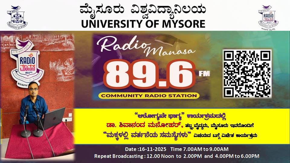 ವಿಜಯ್ ಕುಮಾರ್ ಎಸ್. ಜಿಲ್ಲಾ ನಿರೂಪಣಾಧಿಕಾರಿಗಳು, ಮಹಿಳಾ ಮತ್ತು ಮಕ್ಕಳ ಅಭಿವೃದ್ಧಿ ಇಲಾಖೆ, ಉಪ ನಿರ್ದೇಶಕರು ಕಛೇರಿ, ಮೈಸೂರು, ವಿಶ್ವವಿದ್ಯಾನಿಲಯ, ಮೈಸೂರು ಇವರು " ಪೋಷಣ್ ಅಭಿಯಾನ್ ಯೋಜನೆ " ಕುರಿತು ವಿಶೇಷ ಕಾರ್ಯಕ್ರಮ ನಮ್ಮ ರೇಡಿಯೋ ಮಾನಸ CRS 89.6 FM App ಹಾಗೂ 89.6 FM ಕಂಪನಾಂಕದಲ್ಲಿ ದಿನಾಂಕ:25/10/2025ರಂದು ಈ ಕಾರ್ಯಕ್ರಮವು ಬೆಳಿಗ್ಗೆ 7 ಗಂಟೆಗೆ ಪ್ರಸಾರವಾಗುತ್ತಿದ್ದು, ಎಲ್ಲಾರು ಸಹ ಕೇಳಬಹುದಾಗಿದೆ. ಇದೇ ಕಾರ್ಯಕ್ರಮವು ಮಧ್ಯಾಹ್ನ 12 ಗಂಟೆಗೆ ಮತ್ತು ಸಂಜೆ 4ಗಂಟೆಗೆ ಮರು ಪ್ರಸಾರವಾಗುತ್ತದೆ. Radio Manasa CRS 89.6 FM App Google Play Store ನಲ್ಲಿ ಲಭ್ಯವಿದ್ದು. ಎಲ್ಲರು Download ಮಾಡ ಬಹುದಾಗಿದೆ. ಅಥವಾ ಈ ಕೆಳಗಿರುವ ಲಿಂಕ್ ಅನ್ನು ಒತ್ತಿ ರೇಡಿಯೋ ಮಾನಸ App ಅನ್ನು Download ಮಾಡಿ ಕೊಂಡು ವಿಶ್ವದಾದ್ಯಂತ ಎಲ್ಲರು ಸಹ ಕೇಳಬಹುದು. https://play.google.com/store/apps/details?id=com.manasa ಪ್ರತಿ ದಿನ ನಮ್ಮ ಮೈಸೂರು ವಿಶ್ವವಿದ್ಯಾನಿಲಯ ಪ್ರಸ್ತುತ ಪಡಿಸುವ ರೇಡಿಯೋ ಮಾನಸದ ಕಾರ್ಯಕ್ರಮವು ಈ ಕೆಳಕಂಡ ಸಮಯದಲ್ಲಿ ಪ್ರಸಾರವಾಗುತ್ತದೆ 7AM to 9AM, 12Noon to 2PM, 4PM to 6 PM.