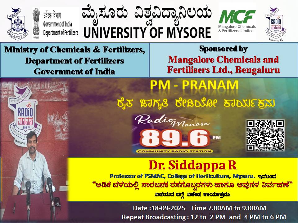 ರೇಡಿಯೋ ಮಾನಸ 89.6 FM ಮೈಸೂರು ವಿಶ್ವವಿದ್ಯಾನಿಲಯ  ಮತ್ತು  ರಾಸಾಯನಿಕಗಳು ಮತ್ತು ರಸಗೊಬ್ಬರಗಳ ಸಚಿವಾಲಯ ರಸಗೊಬ್ಬರಗಳ ಇಲಾಖೆ ಭಾರತ ಸರ್ಕಾರ ಇವರು ಪ್ರಾಯೋಜಿಸಲ್ಪಟ್ಟಿರುವ ಮಂಗಳೂರು ಕೆಮಿಕಲ್ಸ್ ಮತ್ತು ಫರ್ಟಿಲೈಸರ್ಸ್ ಪ್ರೈವೇಟ್ ಲಿಮಿಟೆಡ್ ಬೆಂಗಳೂರು  ಇವರೊಂದಿಗೆ ಜಂಟಿಯಾಗಿ ಆಯೋಜಿಸಿರುವ ವಿಶೇಷ ಸರಣಿ ಕಾರ್ಯಕ್ರಮದಲ್ಲಿ Dr. Siddappa R, Professor of PSMAC, College of Horticulture, Mysuru  ಇವರು    " ಅಡಿಕೆ ಬೆಳೆಯಲ್ಲಿ ಸಾರಜನಕ ರಸಗೊಬ್ಬರಗಳು ಹಾಗೂ ಅವುಗಳ ನಿರ್ವಹಣೆ " ವಿಶೇಷ ಕಾರ್ಯಕ್ರಮವು  ನಮ್ಮ ರೇಡಿಯೋ ಮಾನಸ CRS 89.6 FM App ಹಾಗೂ 89.6 FM ಕಂಪನಾಂಕದಲ್ಲಿ ದಿನಾಂಕ:18/09/2025ರಂದು ಬೆಳಿಗ್ಗೆ 7 ಗಂಟೆಗೆ ಪ್ರಸಾರವಾಗುತ್ತಿದ್ದು, ಎಲ್ಲಾರು ಸಹ ಕೇಳಬಹುದಾಗಿದೆ. ಇದೇ ಕಾರ್ಯಕ್ರಮವು ಮಧ್ಯಾಹ್ನ 12 ಗಂಟೆಗೆ ಮತ್ತು ಸಂಜೆ 4ಗಂಟೆಗೆ ಮರು ಪ್ರಸಾರವಾಗುತ್ತದೆ. Radio Manasa CRS 89.6 FM App Google Play Store ನಲ್ಲಿ ಲಭ್ಯವಿದ್ದು. ಎಲ್ಲರು Download ಮಾಡ ಬಹುದಾಗಿದೆ. ಅಥವಾ ಈ ಕೆಳಗಿರುವ ಲಿಂಕ್ ಅನ್ನು ಒತ್ತಿ ರೇಡಿಯೋ ಮಾನಸ App ಅನ್ನು Download ಮಾಡಿ ಕೊಂಡು ವಿಶ್ವದಾದ್ಯಂತ ಎಲ್ಲರು ಸಹ ಕೇಳಬಹುದು. https://play.google.com/store/apps/details?id=com.manasa ಪ್ರತಿ ದಿನ ನಮ್ಮ ಮೈಸೂರು ವಿಶ್ವವಿದ್ಯಾನಿಲಯ ಪ್ರಸ್ತುತ ಪಡಿಸುವ ರೇಡಿಯೋ ಮಾನಸದ ಕಾರ್ಯಕ್ರಮವು ಈ ಕೆಳಕಂಡ ಸಮಯದಲ್ಲಿ ಪ್ರಸಾರವಾಗುತ್ತದೆ 7AM to 9AM, 12Noon to 2PM, 4PM to 6 PM.
