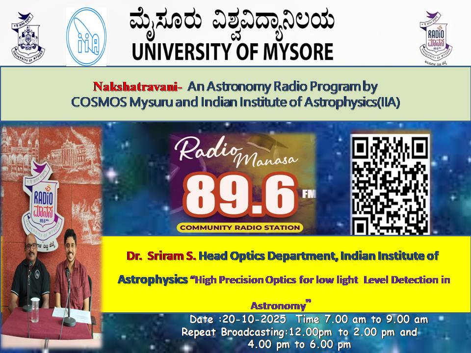 ರೇಡಿಯೋ ಮಾನಸ 89.6 FM ಮೈಸೂರು ವಿಶ್ವವಿದ್ಯಾನಿಲಯ  ಮತ್ತು   Nakshatravani - An Astronomy Radio Program COSMOS and Indian Institute of Astrophysics (IIA) Mysuru ಜಂಟಿಯಾಗಿ ಆಯೋಜಿಸಿರುವ ವಿಶೇಷ ಸರಣಿ ಕಾರ್ಯಕ್ರಮದಲ್ಲಿ   "High Precision Optics for low light Level Detection in Astronomy" ವಿಷಯದ ಬಗ್ಗೆ ಕಾರ್ಯಕ್ರಮದಲ್ಲಿ Dr. Sriram S. Head Optics department Indian Institute of Astrophysics  ಇವರ ವಿಶೇಷ ಕಾರ್ಯಕ್ರಮವು  ನಮ್ಮ ರೇಡಿಯೋ ಮಾನಸ CRS 89.6 FM App ಹಾಗೂ 89.6 FM ಕಂಪನಾಂಕದಲ್ಲಿ ದಿನಾಂಕ:20/10/2025ರಂದು  ಈ ಕಾರ್ಯಕ್ರಮ ಬೆಳಿಗ್ಗೆ 7 ಗಂಟೆಗೆ ಪ್ರಸಾರವಾಗುತ್ತಿದ್ದು, ಎಲ್ಲಾರು ಸಹ ಕೇಳಬಹುದಾಗಿದೆ. ಇದೇ ಕಾರ್ಯಕ್ರಮವು ಮಧ್ಯಾಹ್ನ 12 ಗಂಟೆಗೆ ಮತ್ತು ಸಂಜೆ 4ಗಂಟೆಗೆ ಮರು ಪ್ರಸಾರವಾಗುತ್ತದೆ. Radio Manasa CRS 89.6 FM App Google Play Store ನಲ್ಲಿ ಲಭ್ಯವಿದ್ದು. ಎಲ್ಲರು Download ಮಾಡ ಬಹುದಾಗಿದೆ. ಅಥವಾ ಈ ಕೆಳಗಿರುವ ಲಿಂಕ್ ಅನ್ನು ಒತ್ತಿ ರೇಡಿಯೋ ಮಾನಸ App ಅನ್ನು Download ಮಾಡಿ ಕೊಂಡು ವಿಶ್ವದಾದ್ಯಂತ ಎಲ್ಲರು ಸಹ ಕೇಳಬಹುದು. https://play.google.com/store/apps/details?id=com.manasa ಪ್ರತಿ ದಿನ ನಮ್ಮ ಮೈಸೂರು ವಿಶ್ವವಿದ್ಯಾನಿಲಯ ಪ್ರಸ್ತುತ ಪಡಿಸುವ ರೇಡಿಯೋ ಮಾನಸದ ಕಾರ್ಯಕ್ರಮವು ಈ ಕೆಳಕಂಡ ಸಮಯದಲ್ಲಿ  ಪ್ರಸಾರವಾಗುತ್ತದೆ 7AM to 9AM, 12Noon to 2PM, 4PM to 6 PM.