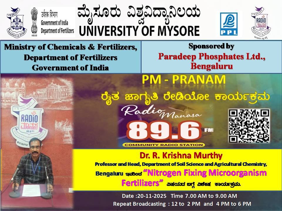 ರೇಡಿಯೋ ಮಾನಸ 89.6 FM ಮೈಸೂರು ವಿಶ್ವವಿದ್ಯಾನಿಲಯ ಮತ್ತು ರಾಸಾಯನಿಕಗಳು ಮತ್ತು ರಸಗೊಬ್ಬರಗಳ ಸಚಿವಾಲಯ ರಸಗೊಬ್ಬರಗಳ ಇಲಾಖೆ ಭಾರತ ಸರ್ಕಾರ ಇವರು ಪ್ರಾಯೋಜಿಸಲ್ಪಟ್ಟಿರುವ ಪಾರದೀಪ್ ಪಾಸ್ಪೇಟ್ಸ್ ಲಿಮಿಟೆಡ್ ಬೆಂಗಳೂರು ಇವರೊಂದಿಗೆ ಜಂಟಿಯಾಗಿ ಆಯೋಜಿಸಿರುವ ವಿಶೇಷ ಸರಣಿ ಕಾರ್ಯಕ್ರಮದಲ್ಲಿ Dr.Krishna Murthy, Professor and Head, Department of Soil Science and Agriculture Chemistry, Bengaluru ಇವರು " Nitrogen Fixing Microorganism Fertilizers " ವಿಶೇಷ ಕಾರ್ಯಕ್ರಮವು ನಮ್ಮ ರೇಡಿಯೋ ಮಾನಸ CRS 89.6 FM App ಹಾಗೂ 89.6 FM ಕಂಪನಾಂಕದಲ್ಲಿ ದಿನಾಂಕ:20/11/2025ರಂದು ಬೆಳಿಗ್ಗೆ 7 ಗಂಟೆಗೆ ಪ್ರಸಾರವಾಗುತ್ತಿದ್ದು, ಎಲ್ಲಾರು ಸಹ ಕೇಳಬಹುದಾಗಿದೆ. ಇದೇ ಕಾರ್ಯಕ್ರಮವು ಮಧ್ಯಾಹ್ನ 12 ಗಂಟೆಗೆ ಮತ್ತು ಸಂಜೆ 4ಗಂಟೆಗೆ ಮರು ಪ್ರಸಾರವಾಗುತ್ತದೆ. Radio Manasa CRS 89.6 FM App Google Play Store ನಲ್ಲಿ ಲಭ್ಯವಿದ್ದು. ಎಲ್ಲರು Download ಮಾಡ ಬಹುದಾಗಿದೆ. ಅಥವಾ ಈ ಕೆಳಗಿರುವ ಲಿಂಕ್ ಅನ್ನು ಒತ್ತಿ ರೇಡಿಯೋ ಮಾನಸ App ಅನ್ನು Download ಮಾಡಿ ಕೊಂಡು ವಿಶ್ವದಾದ್ಯಂತ ಎಲ್ಲರು ಸಹ ಕೇಳಬಹುದು. https://play.google.com/store/apps/details?id=com.manasa ಪ್ರತಿ ದಿನ ನಮ್ಮ ಮೈಸೂರು ವಿಶ್ವವಿದ್ಯಾನಿಲಯ ಪ್ರಸ್ತುತ ಪಡಿಸುವ ರೇಡಿಯೋ ಮಾನಸದ ಕಾರ್ಯಕ್ರಮವು ಈ ಕೆಳಕಂಡ ಸಮಯದಲ್ಲಿ ಪ್ರಸಾರವಾಗುತ್ತದೆ 7AM to 9AM, 12Noon to 2PM, 4PM to 6 PM.