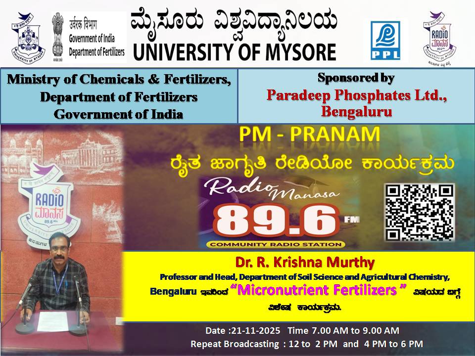 ರೇಡಿಯೋ ಮಾನಸ 89.6 FM ಮೈಸೂರು ವಿಶ್ವವಿದ್ಯಾನಿಲಯ ಮತ್ತು ರಾಸಾಯನಿಕಗಳು ಮತ್ತು ರಸಗೊಬ್ಬರಗಳ ಸಚಿವಾಲಯ ರಸಗೊಬ್ಬರಗಳ ಇಲಾಖೆ ಭಾರತ ಸರ್ಕಾರ ಇವರು ಪ್ರಾಯೋಜಿಸಲ್ಪಟ್ಟಿರುವ ಪಾರದೀಪ್ ಪಾಸ್ಪೇಟ್ಸ್ ಲಿಮಿಟೆಡ್ ಬೆಂಗಳೂರು ಇವರೊಂದಿಗೆ ಜಂಟಿಯಾಗಿ ಆಯೋಜಿಸಿರುವ ವಿಶೇಷ ಸರಣಿ ಕಾರ್ಯಕ್ರಮದಲ್ಲಿ Dr.Krishna Murthy, Professor and Head, Department of Soil Science and Agriculture Chemistry, Bengaluru ಇವರು "Micronutrient Fertilizers " ವಿಶೇಷ ಕಾರ್ಯಕ್ರಮವು ನಮ್ಮ ರೇಡಿಯೋ ಮಾನಸ CRS 89.6 FM App ಹಾಗೂ 89.6 FM ಕಂಪನಾಂಕದಲ್ಲಿ ದಿನಾಂಕ:21/11/2025ರಂದು ಬೆಳಿಗ್ಗೆ 7 ಗಂಟೆಗೆ ಪ್ರಸಾರವಾಗುತ್ತಿದ್ದು, ಎಲ್ಲಾರು ಸಹ ಕೇಳಬಹುದಾಗಿದೆ. ಇದೇ ಕಾರ್ಯಕ್ರಮವು ಮಧ್ಯಾಹ್ನ 12 ಗಂಟೆಗೆ ಮತ್ತು ಸಂಜೆ 4ಗಂಟೆಗೆ ಮರು ಪ್ರಸಾರವಾಗುತ್ತದೆ. Radio Manasa CRS 89.6 FM App Google Play Store ನಲ್ಲಿ ಲಭ್ಯವಿದ್ದು. ಎಲ್ಲರು Download ಮಾಡ ಬಹುದಾಗಿದೆ. ಅಥವಾ ಈ ಕೆಳಗಿರುವ ಲಿಂಕ್ ಅನ್ನು ಒತ್ತಿ ರೇಡಿಯೋ ಮಾನಸ App ಅನ್ನು Download ಮಾಡಿ ಕೊಂಡು ವಿಶ್ವದಾದ್ಯಂತ ಎಲ್ಲರು ಸಹ ಕೇಳಬಹುದು. https://play.google.com/store/apps/details?id=com.manasa ಪ್ರತಿ ದಿನ ನಮ್ಮ ಮೈಸೂರು ವಿಶ್ವವಿದ್ಯಾನಿಲಯ ಪ್ರಸ್ತುತ ಪಡಿಸುವ ರೇಡಿಯೋ ಮಾನಸದ ಕಾರ್ಯಕ್ರಮವು ಈ ಕೆಳಕಂಡ ಸಮಯದಲ್ಲಿ ಪ್ರಸಾರವಾಗುತ್ತದೆ 7AM to 9AM, 12Noon to 2PM, 4PM to 6 PM.