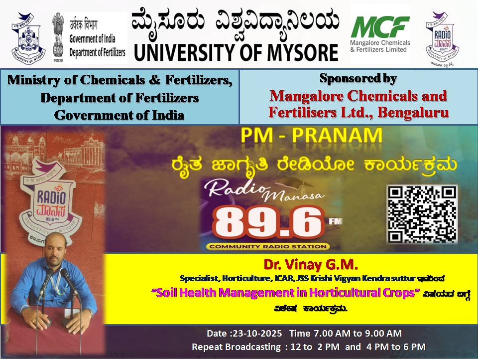 ರೇಡಿಯೋ ಮಾನಸ 89.6 FM ಮೈಸೂರು ವಿಶ್ವವಿದ್ಯಾನಿಲಯ  ಮತ್ತು  ರಾಸಾಯನಿಕಗಳು ಮತ್ತು ರಸಗೊಬ್ಬರಗಳ ಸಚಿವಾಲಯ ರಸಗೊಬ್ಬರಗಳ ಇಲಾಖೆ ಭಾರತ ಸರ್ಕಾರ ಇವರು ಪ್ರಾಯೋಜಿಸಲ್ಪಟ್ಟಿರುವ ಮಂಗಳೂರು ಕೆಮಿಕಲ್ಸ್ ಮತ್ತು ಫರ್ಟಿಲೈಸರ್ಸ್ ಪ್ರೈವೇಟ್ ಲಿಮಿಟೆಡ್ ಬೆಂಗಳೂರು  ಇವರೊಂದಿಗೆ ಜಂಟಿಯಾಗಿ ಆಯೋಜಿಸಿರುವ ವಿಶೇಷ ಸರಣಿ ಕಾರ್ಯಕ್ರಮದಲ್ಲಿ Dr. Vinay  G. M.  Specialist, Horticultural, ICAR, JSS Krishi Vigyan Kendra, Suttur ಇವರು    " Soil Health Management in Horticultural crop" ವಿಶೇಷ ಕಾರ್ಯಕ್ರಮವು  ನಮ್ಮ ರೇಡಿಯೋ ಮಾನಸ CRS 89.6 FM App ಹಾಗೂ 89.6 FM ಕಂಪನಾಂಕದಲ್ಲಿ ದಿನಾಂಕ:23/10/2025ರಂದು ಬೆಳಿಗ್ಗೆ 7 ಗಂಟೆಗೆ ಪ್ರಸಾರವಾಗುತ್ತಿದ್ದು, ಎಲ್ಲಾರು ಸಹ ಕೇಳಬಹುದಾಗಿದೆ. ಇದೇ ಕಾರ್ಯಕ್ರಮವು ಮಧ್ಯಾಹ್ನ 12 ಗಂಟೆಗೆ ಮತ್ತು ಸಂಜೆ 4ಗಂಟೆಗೆ ಮರು ಪ್ರಸಾರವಾಗುತ್ತದೆ. Radio Manasa CRS 89.6 FM App Google Play Store ನಲ್ಲಿ ಲಭ್ಯವಿದ್ದು. ಎಲ್ಲರು Download ಮಾಡ ಬಹುದಾಗಿದೆ. ಅಥವಾ ಈ ಕೆಳಗಿರುವ ಲಿಂಕ್ ಅನ್ನು ಒತ್ತಿ ರೇಡಿಯೋ ಮಾನಸ App ಅನ್ನು Download ಮಾಡಿ ಕೊಂಡು ವಿಶ್ವದಾದ್ಯಂತ ಎಲ್ಲರು ಸಹ ಕೇಳಬಹುದು. https://play.google.com/store/apps/details?id=com.manasa ಪ್ರತಿ ದಿನ ನಮ್ಮ ಮೈಸೂರು ವಿಶ್ವವಿದ್ಯಾನಿಲಯ ಪ್ರಸ್ತುತ ಪಡಿಸುವ ರೇಡಿಯೋ ಮಾನಸದ ಕಾರ್ಯಕ್ರಮವು ಈ ಕೆಳಕಂಡ ಸಮಯದಲ್ಲಿ ಪ್ರಸಾರವಾಗುತ್ತದೆ 7AM to 9AM, 12Noon to 2PM, 4PM to 6 PM.