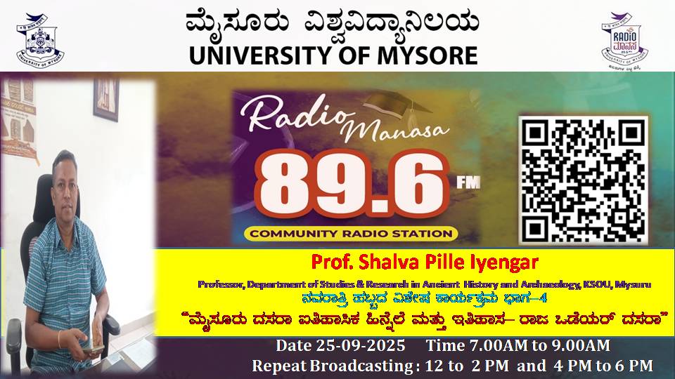 Prof. Shalva Pille Iyengar, Professor, Department of Studies and Research in Ancient History and Archaeology, KSOU, Mysuru, ನವರಾತ್ರಿ ಹಬ್ಬದ ವಿಶೇಷ ಕಾರ್ಯಕ್ರಮ ಭಾಗ-4   ಇವರು  "ಮೈಸೂರು ದಸರಾ ಐತಿಹಾಸಿಕ ಹಿನ್ನೆಲೆ ಮತ್ತು ಇತಿಹಾಸ  - ರಾಜ ಒಡೆಯರ್  ದಸರಾ" ಕುರಿತು ವಿಶೇಷ  ಕಾರ್ಯಕ್ರಮ  ನಮ್ಮ ರೇಡಿಯೋ ಮಾನಸ CRS 89.6 FM App ಹಾಗೂ 89.6 FM ಕಂಪನಾಂಕದಲ್ಲಿ ದಿನಾಂಕ:25/09/2025ರಂದು ಈ ಕಾರ್ಯಕ್ರಮವು ಬೆಳಿಗ್ಗೆ 7 ಗಂಟೆಗೆ ಪ್ರಸಾರವಾಗುತ್ತಿದ್ದು, ಎಲ್ಲಾರು ಸಹ ಕೇಳಬಹುದಾಗಿದೆ. ಇದೇ ಕಾರ್ಯಕ್ರಮವು ಮಧ್ಯಾಹ್ನ 12 ಗಂಟೆಗೆ ಮತ್ತು ಸಂಜೆ 4ಗಂಟೆಗೆ ಮರು ಪ್ರಸಾರವಾಗುತ್ತದೆ. Radio Manasa CRS 89.6 FM App Google Play Store ನಲ್ಲಿ ಲಭ್ಯವಿದ್ದು. ಎಲ್ಲರು Download ಮಾಡ ಬಹುದಾಗಿದೆ. ಅಥವಾ ಈ ಕೆಳಗಿರುವ ಲಿಂಕ್ ಅನ್ನು ಒತ್ತಿ ರೇಡಿಯೋ ಮಾನಸ App ಅನ್ನು Download ಮಾಡಿ ಕೊಂಡು ವಿಶ್ವದಾದ್ಯಂತ ಎಲ್ಲರು ಸಹ ಕೇಳಬಹುದು. https://play.google.com/store/apps/details?id=com.manasa ಪ್ರತಿ ದಿನ ನಮ್ಮ ಮೈಸೂರು ವಿಶ್ವವಿದ್ಯಾನಿಲಯ  ಪ್ರಸ್ತುತ ಪಡಿಸುವ ರೇಡಿಯೋ ಮಾನಸದ ಕಾರ್ಯಕ್ರಮವು ಈ ಕೆಳಕಂಡ ಸಮಯದಲ್ಲಿ ಪ್ರಸಾರವಾಗುತ್ತದೆ 7AM to 9AM, 12Noon to 2PM, 4PM to 6 PM.
