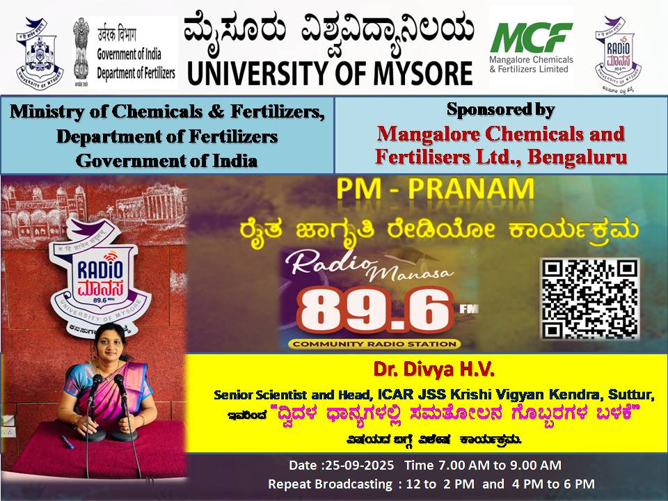 ರೇಡಿಯೋ ಮಾನಸ 89.6 FM ಮೈಸೂರು ವಿಶ್ವವಿದ್ಯಾನಿಲಯ  ಮತ್ತು  ರಾಸಾಯನಿಕಗಳು ಮತ್ತು ರಸಗೊಬ್ಬರಗಳ ಸಚಿವಾಲಯ ರಸಗೊಬ್ಬರಗಳ ಇಲಾಖೆ ಭಾರತ ಸರ್ಕಾರ ಇವರು ಪ್ರಾಯೋಜಿಸಲ್ಪಟ್ಟಿರುವ ಮಂಗಳೂರು ಕೆಮಿಕಲ್ಸ್ ಮತ್ತು ಫರ್ಟಿಲೈಸರ್ಸ್ ಪ್ರೈವೇಟ್ ಲಿಮಿಟೆಡ್ ಬೆಂಗಳೂರು  ಇವರೊಂದಿಗೆ ಜಂಟಿಯಾಗಿ ಆಯೋಜಿಸಿರುವ ವಿಶೇಷ ಸರಣಿ ಕಾರ್ಯಕ್ರಮದಲ್ಲಿ Dr. Divya H V, Senior Scientist and Head,  ICAR JSS Krishi Vigyan Kendra, suttur   ಇವರು    " ದ್ವಿದಳ ಧಾನ್ಯಗಳ ಸಮತೋಲನ ಗೊಬ್ಬರಗಳ ಬಳಕೆ  " ವಿಶೇಷ ಕಾರ್ಯಕ್ರಮವು  ನಮ್ಮ ರೇಡಿಯೋ ಮಾನಸ CRS 89.6 FM App ಹಾಗೂ 89.6 FM ಕಂಪನಾಂಕದಲ್ಲಿ ದಿನಾಂಕ:25/09/2025ರಂದು ಬೆಳಿಗ್ಗೆ 7 ಗಂಟೆಗೆ ಪ್ರಸಾರವಾಗುತ್ತಿದ್ದು, ಎಲ್ಲಾರು ಸಹ ಕೇಳಬಹುದಾಗಿದೆ. ಇದೇ ಕಾರ್ಯಕ್ರಮವು ಮಧ್ಯಾಹ್ನ 12 ಗಂಟೆಗೆ ಮತ್ತು ಸಂಜೆ 4ಗಂಟೆಗೆ ಮರು ಪ್ರಸಾರವಾಗುತ್ತದೆ. Radio Manasa CRS 89.6 FM App Google Play Store ನಲ್ಲಿ ಲಭ್ಯವಿದ್ದು. ಎಲ್ಲರು Download ಮಾಡ ಬಹುದಾಗಿದೆ. ಅಥವಾ ಈ ಕೆಳಗಿರುವ ಲಿಂಕ್ ಅನ್ನು ಒತ್ತಿ ರೇಡಿಯೋ ಮಾನಸ App ಅನ್ನು Download ಮಾಡಿ ಕೊಂಡು ವಿಶ್ವದಾದ್ಯಂತ ಎಲ್ಲರು ಸಹ ಕೇಳಬಹುದು. https://play.google.com/store/apps/details?id=com.manasa ಪ್ರತಿ ದಿನ ನಮ್ಮ ಮೈಸೂರು ವಿಶ್ವವಿದ್ಯಾನಿಲಯ ಪ್ರಸ್ತುತ ಪಡಿಸುವ ರೇಡಿಯೋ ಮಾನಸದ ಕಾರ್ಯಕ್ರಮವು ಈ ಕೆಳಕಂಡ ಸಮಯದಲ್ಲಿ ಪ್ರಸಾರವಾಗುತ್ತದೆ 7AM to 9AM, 12Noon to 2PM, 4PM to 6 PM.