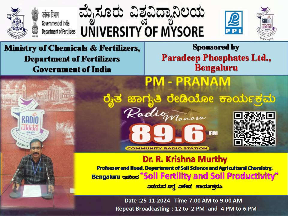 ರೇಡಿಯೋ ಮಾನಸ 89.6 FM ಮೈಸೂರು ವಿಶ್ವವಿದ್ಯಾನಿಲಯ ಮತ್ತು ರಾಸಾಯನಿಕಗಳು ಮತ್ತು ರಸಗೊಬ್ಬರಗಳ ಸಚಿವಾಲಯ ರಸಗೊಬ್ಬರಗಳ ಇಲಾಖೆ ಭಾರತ ಸರ್ಕಾರ ಇವರು ಪ್ರಾಯೋಜಿಸಲ್ಪಟ್ಟಿರುವ ಪಾರದೀಪ್ ಪಾಸ್ಪೇಟ್ಸ್ ಲಿಮಿಟೆಡ್ ಬೆಂಗಳೂರು ಇವರೊಂದಿಗೆ ಜಂಟಿಯಾಗಿ ಆಯೋಜಿಸಿರುವ ವಿಶೇಷ ಸರಣಿ ಕಾರ್ಯಕ್ರಮದಲ್ಲಿ Dr.Krishna Murthy, Professor and Head, Department of Soil Science and Agriculture Chemistry, Bengaluru ಇವರು "Soil Fertility and Soil Productivity" ವಿಶೇಷ ಕಾರ್ಯಕ್ರಮವು ನಮ್ಮ ರೇಡಿಯೋ ಮಾನಸ CRS 89.6 FM App ಹಾಗೂ 89.6 FM ಕಂಪನಾಂಕದಲ್ಲಿ ದಿನಾಂಕ:25/11/2025ರಂದು ಬೆಳಿಗ್ಗೆ 7 ಗಂಟೆಗೆ ಪ್ರಸಾರವಾಗುತ್ತಿದ್ದು, ಎಲ್ಲಾರು ಸಹ ಕೇಳಬಹುದಾಗಿದೆ. ಇದೇ ಕಾರ್ಯಕ್ರಮವು ಮಧ್ಯಾಹ್ನ 12 ಗಂಟೆಗೆ ಮತ್ತು ಸಂಜೆ 4ಗಂಟೆಗೆ ಮರು ಪ್ರಸಾರವಾಗುತ್ತದೆ. Radio Manasa CRS 89.6 FM App Google Play Store ನಲ್ಲಿ ಲಭ್ಯವಿದ್ದು. ಎಲ್ಲರು Download ಮಾಡ ಬಹುದಾಗಿದೆ. ಅಥವಾ ಈ ಕೆಳಗಿರುವ ಲಿಂಕ್ ಅನ್ನ ಒತ್ತಿ ರೇಡಿಯೋ ಮಾನಸ App ಅನ್ನು Download ಮಾಡಿ ಕೊಂಡು ವಿಶ್ವದಾದ್ಯಂತ ಎಲ್ಲರು ಸಹ ಕೇಳಬಹುದು. https://play.google.com/store/apps/details?id=com.manasa ಪ್ರತಿ ದಿನ ನಮ್ಮ ಮೈಸೂರು ವಿಶ್ವವಿದ್ಯಾನಿಲಯ ಪ್ರಸ್ತುತ ಪಡಿಸುವ ರೇಡಿಯೋ ಮಾನಸದ ಕಾರ್ಯಕ್ರಮವು ಈ ಕೆಳಕಂಡ ಸಮಯದಲ್ಲಿ ಪ್ರಸಾರವಾಗುತ್ತದೆ 7AM to 9AM, 12Noon to 2PM, 4PM to 6 PM.