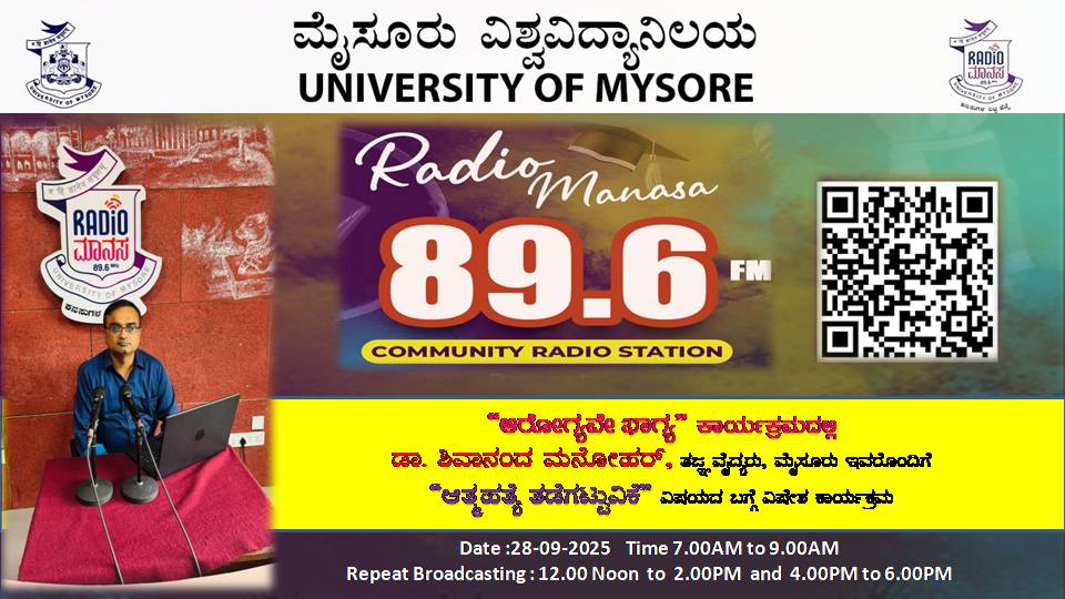 ಡಾ. ಶಿವಾನಂದ ಮನೋಹರ್, ತಜ್ಞ ವೈದ್ಯರು, ಮೈಸೂರು ಇವರು  ಆರೋಗ್ಯವೇ ಭಾಗ್ಯ ವಿಶೇಷ ಕಾರ್ಯಕ್ರಮದಲ್ಲಿ   " ಆತ್ಮಹತ್ಯೆ ತಡೆಗಟ್ಟುವಿಕೆ  " ಬಗ್ಗೆ ಉಪನ್ಯಾಸ  ಕಾರ್ಯಕ್ರಮ  ನಮ್ಮ ರೇಡಿಯೋ ಮಾನಸ CRS 89.6 FM App ಹಾಗೂ 89.6 FM ಕಂಪನಾಂಕದಲ್ಲಿ ದಿನಾಂಕ:28/09/2025ರಂದು ಈ ಕಾರ್ಯಕ್ರಮವು ಬೆಳಿಗ್ಗೆ 7 ಗಂಟೆಗೆ ಪ್ರಸಾರವಾಗುತ್ತಿದ್ದು, ಎಲ್ಲಾರು ಸಹ ಕೇಳಬಹುದಾಗಿದೆ. ಇದೇ ಕಾರ್ಯಕ್ರಮವು ಮಧ್ಯಾಹ್ನ 12 ಗಂಟೆಗೆ ಮತ್ತು ಸಂಜೆ 4ಗಂಟೆಗೆ ಮರು ಪ್ರಸಾರವಾಗುತ್ತದೆ. Radio Manasa CRS 89.6 FM App Google Play Store ನಲ್ಲಿ ಲಭ್ಯವಿದ್ದು. ಎಲ್ಲರು Download ಮಾಡ ಬಹುದಾಗಿದೆ. ಅಥವಾ ಈ ಕೆಳಗಿರುವ ಲಿಂಕ್ ಅನ್ನು ಒತ್ತಿ ರೇಡಿಯೋ ಮಾನಸ App ಅನ್ನು Download ಮಾಡಿ ಕೊಂಡು ವಿಶ್ವದಾದ್ಯಂತ ಎಲ್ಲರು ಸಹ ಕೇಳಬಹುದು. https://play.google.com/store/apps/details?id=com.manasa ಪ್ರತಿ ದಿನ ನಮ್ಮ ಮೈಸೂರು ವಿಶ್ವವಿದ್ಯಾನಿಲಯ  ಪ್ರಸ್ತುತ ಪಡಿಸುವ ರೇಡಿಯೋ ಮಾನಸದ ಕಾರ್ಯಕ್ರಮವು ಈ ಕೆಳಕಂಡ ಸಮಯದಲ್ಲಿ ಪ್ರಸಾರವಾಗುತ್ತದೆ 7AM to 9AM, 12Noon to 2PM, 4PM to 6 PM.