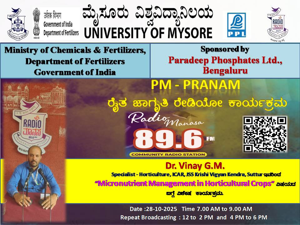 ರೇಡಿಯೋ ಮಾನಸ 89.6 FM ಮೈಸೂರು ವಿಶ್ವವಿದ್ಯಾನಿಲಯ ಮತ್ತು ರಾಸಾಯನಿಕಗಳು ಮತ್ತು ರಸಗೊಬ್ಬರಗಳ ಸಚಿವಾಲಯ ರಸಗೊಬ್ಬರಗಳ ಇಲಾಖೆ ಭಾರತ ಸರ್ಕಾರ ಇವರು ಪ್ರಾಯೋಜಿಸಲ್ಪಟ್ಟಿರುವ ಪಾರದೀಪ್ ಪಾಸ್ಪೇಟ್ಸ್ ಪ್ರೈವೇಟ್ ಲಿಮಿಟೆಡ್ ಬೆಂಗಳೂರು ಇವರೊಂದಿಗೆ ಜಂಟಿಯಾಗಿ ಆಯೋಜಿಸಿರುವ ವಿಶೇಷ ಸರಣಿ ಕಾರ್ಯಕ್ರಮದಲ್ಲಿ Dr. Vinay G. M. Specialist - Horticultural, ICAR, JSS Krishi Vigyan Kendra, Suttur ಇವರು "Micronutrient Management in Horticultural Crops " ವಿಶೇಷ ಕಾರ್ಯಕ್ರಮವು ನಮ್ಮ ರೇಡಿಯೋ ಮಾನಸ CRS 89.6 FM App ಹಾಗೂ 89.6 FM ಕಂಪನಾಂಕದಲ್ಲಿ ದಿನಾಂಕ:28/10/2025ರಂದು ಬೆಳಿಗ್ಗೆ 7 ಗಂಟೆಗೆ ಪ್ರಸಾರವಾಗುತ್ತಿದ್ದು, ಎಲ್ಲಾರು ಸಹ ಕೇಳಬಹುದಾಗಿದೆ. ಇದೇ ಕಾರ್ಯಕ್ರಮವು ಮಧ್ಯಾಹ್ನ 12 ಗಂಟೆಗೆ ಮತ್ತು ಸಂಜೆ 4ಗಂಟೆಗೆ ಮರು ಪ್ರಸಾರವಾಗುತ್ತದೆ. Radio Manasa CRS 89.6 FM App Google Play Store ನಲ್ಲಿ ಲಭ್ಯವಿದ್ದು. ಎಲ್ಲರು Download ಮಾಡ ಬಹುದಾಗಿದೆ. ಅಥವಾ ಈ ಕೆಳಗಿರುವ ಲಿಂಕ್ ಅನ್ನು ಒತ್ತಿ ರೇಡಿಯೋ ಮಾನಸ App ಅನ್ನು Download ಮಾಡಿ ಕೊಂಡು ವಿಶ್ವದಾದ್ಯಂತ ಎಲ್ಲರು ಸಹ ಕೇಳಬಹುದು. https://play.google.com/store/apps/details?id=com.manasa ಪ್ರತಿ ದಿನ ನಮ್ಮ ಮೈಸೂರು ವಿಶ್ವವಿದ್ಯಾನಿಲಯ ಪ್ರಸ್ತುತ ಪಡಿಸುವ ರೇಡಿಯೋ ಮಾನಸದ ಕಾರ್ಯಕ್ರಮವು ಈ ಕೆಳಕಂಡ ಸಮಯದಲ್ಲಿ ಪ್ರಸಾರವಾಗುತ್ತದೆ 7AM to 9AM, 12Noon to 2PM, 4PM to 6 PM.