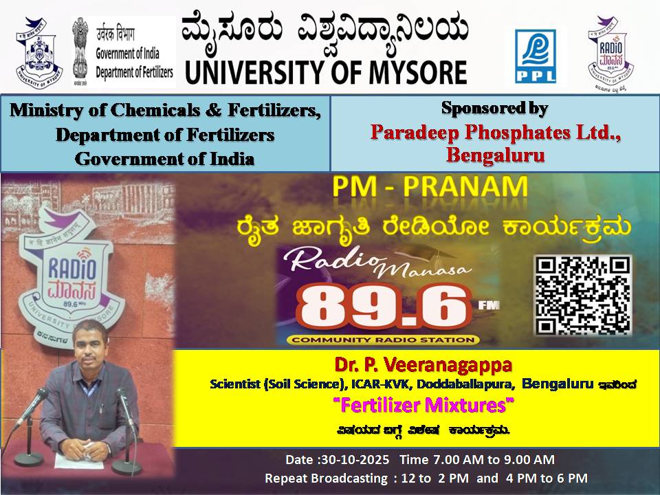 ರೇಡಿಯೋ ಮಾನಸ 89.6 FM ಮೈಸೂರು ವಿಶ್ವವಿದ್ಯಾನಿಲಯ ಮತ್ತು ರಾಸಾಯನಿಕಗಳು ಮತ್ತು ರಸಗೊಬ್ಬರಗಳ ಸಚಿವಾಲಯ ರಸಗೊಬ್ಬರಗಳ ಇಲಾಖೆ ಭಾರತ ಸರ್ಕಾರ ಇವರು ಪ್ರಾಯೋಜಿಸಲ್ಪಟ್ಟಿರುವ ಪಾರದೀಪ್ ಪಾಸ್ಪೇಟ್ಸ್ ಪ್ರೈವೇಟ್ ಲಿಮಿಟೆಡ್ ಬೆಂಗಳೂರು ಇವರೊಂದಿಗೆ ಜಂಟಿಯಾಗಿ ಆಯೋಜಿಸಿರುವ ವಿಶೇಷ ಸರಣಿ ಕಾರ್ಯಕ್ರಮದಲ್ಲಿ Dr.Veeranagappa, Scientist( Soil Science ),ICAR - KVK, Doddaballapura, Bengaluru ಇವರು " Fertilizer Mixtures " ವಿಶೇಷ ಕಾರ್ಯಕ್ರಮವು ನಮ್ಮ ರೇಡಿಯೋ ಮಾನಸ CRS 89.6 FM App ಹಾಗೂ 89.6 FM ಕಂಪನಾಂಕದಲ್ಲಿ ದಿನಾಂಕ:30/10/2025ರಂದು ಬೆಳಿಗ್ಗೆ 7 ಗಂಟೆಗೆ ಪ್ರಸಾರವಾಗುತ್ತಿದ್ದು, ಎಲ್ಲಾರು ಸಹ ಕೇಳಬಹುದಾಗಿದೆ. ಇದೇ ಕಾರ್ಯಕ್ರಮವು ಮಧ್ಯಾಹ್ನ 12 ಗಂಟೆಗೆ ಮತ್ತು ಸಂಜೆ 4ಗಂಟೆಗೆ ಮರು ಪ್ರಸಾರವಾಗುತ್ತದೆ. Radio Manasa CRS 89.6 FM App Google Play Store ನಲ್ಲಿ ಲಭ್ಯವಿದ್ದು. ಎಲ್ಲರು Download ಮಾಡ ಬಹುದಾಗಿದೆ. ಅಥವಾ ಈ ಕೆಳಗಿರುವ ಲಿಂಕ್ ಅನ್ನು ಒತ್ತಿ ರೇಡಿಯೋ ಮಾನಸ App ಅನ್ನು Download ಮಾಡಿ ಕೊಂಡು ವಿಶ್ವದಾದ್ಯಂತ ಎಲ್ಲರು ಸಹ ಕೇಳಬಹುದು. https://play.google.com/store/apps/details?id=com.manasa ಪ್ರತಿ ದಿನ ನಮ್ಮ ಮೈಸೂರು ವಿಶ್ವವಿದ್ಯಾನಿಲಯ ಪ್ರಸ್ತುತ ಪಡಿಸುವ ರೇಡಿಯೋ ಮಾನಸದ ಕಾರ್ಯಕ್ರಮವು ಈ ಕೆಳಕಂಡ ಸಮಯದಲ್ಲಿ ಪ್ರಸಾರವಾಗುತ್ತದೆ 7AM to 9AM, 12Noon to 2PM, 4PM to 6 PM.