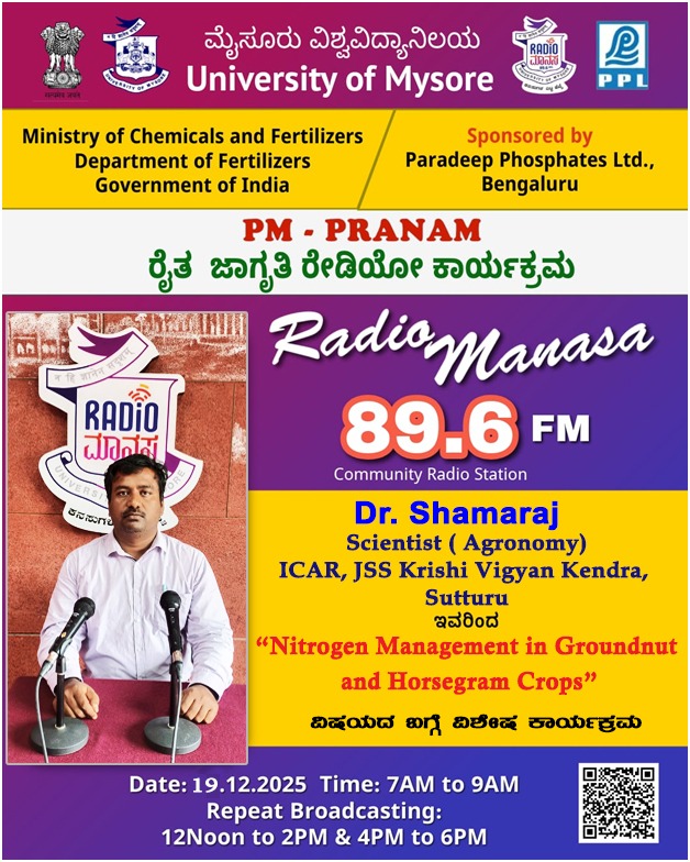 ರೇಡಿಯೋ ಮಾನಸ 89.6 FM ಮೈಸೂರು ವಿಶ್ವವಿದ್ಯಾನಿಲಯ ಮತ್ತು ರಾಸಾಯನಿಕಗಳು ಮತ್ತು ರಸಗೊಬ್ಬರಗಳ ಸಚಿವಾಲಯ ರಸಗೊಬ್ಬರಗಳ ಇಲಾಖೆ ಭಾರತ ಸರ್ಕಾರ ಇವರು ಪ್ರಾಯೋಜಿಸಲ್ಪಟ್ಟಿರುವ ಪಾರದೀಪ್ ಪಾಸ್ಪೇಟ್ಸ್ ಲಿಮಿಟೆಡ್ ಬೆಂಗಳೂರು ಇವರೊಂದಿಗೆ ಜಂಟಿಯಾಗಿ ಆಯೋಜಿಸಿರುವ ವಿಶೇಷ ಸರಣಿ ಕಾರ್ಯಕ್ರಮದಲ್ಲಿ Dr. Shamaraj, Scientist (Astronomy), ICAR JSS KVK, Suttur ಇವರು "Nitrogen Management in Groundnut and Horsegram Crops" ವಿಶೇಷ ಕಾರ್ಯಕ್ರಮವು ನಮ್ಮ ರೇಡಿಯೋ ಮಾನಸ CRS 89.6 FM App ಹಾಗೂ 89.6 FM ಕಂಪನಾಂಕದಲ್ಲಿ ದಿನಾಂಕ:19/12/2025ರಂದು ಬೆಳಿಗ್ಗೆ 7 ಗಂಟೆಗೆ ಪ್ರಸಾರವಾಗುತ್ತಿದ್ದು, ಎಲ್ಲಾರು ಸಹ ಕೇಳಬಹುದಾಗಿದೆ. ಇದೇ ಕಾರ್ಯಕ್ರಮವು ಮಧ್ಯಾಹ್ನ 12 ಗಂಟೆಗೆ ಮತ್ತು ಸಂಜೆ 4ಗಂಟೆಗೆ ಮರು ಪ್ರಸಾರವಾಗುತ್ತದೆ. Radio Manasa CRS 89.6 FM App Google Play Store ನಲ್ಲಿ ಲಭ್ಯವಿದ್ದು. ಎಲ್ಲರು Download ಮಾಡ ಬಹುದಾಗಿದೆ. ಅಥವಾ ಈ ಕೆಳಗಿರುವ ಲಿಂಕ್ ಅನ್ನ ಒತ್ತಿ ರೇಡಿಯೋ ಮಾನಸ App ಅನ್ನು Download ಮಾಡಿ ಕೊಂಡು ವಿಶ್ವದಾದ್ಯಂತ ಎಲ್ಲರು ಸಹ ಕೇಳಬಹುದು. https://play.google.com/store/apps/details?id=com.manasa ಪ್ರತಿ ದಿನ ನಮ್ಮ ಮೈಸೂರು ವಿಶ್ವವಿದ್ಯಾನಿಲಯ ಪ್ರಸ್ತುತ ಪಡಿಸುವ ರೇಡಿಯೋ ಮಾನಸದ ಕಾರ್ಯಕ್ರಮವು ಈ ಕೆಳಕಂಡ ಸಮಯದಲ್ಲಿ ಪ್ರಸಾರವಾಗುತ್ತದೆ 7AM to 9AM, 12Noon to 2PM, 4PM to 6 PM.