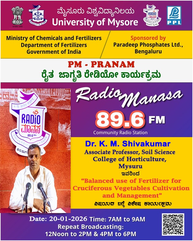 ರೇಡಿಯೋ ಮಾನಸ 89.6 FM ಮೈಸೂರು ವಿಶ್ವವಿದ್ಯಾನಿಲಯ ಮತ್ತು ರಾಸಾಯನಿಕಗಳು ಮತ್ತು ರಸಗೊಬ್ಬರಗಳ ಸಚಿವಾಲಯ ರಸಗೊಬ್ಬರಗಳ ಇಲಾಖೆ ಭಾರತ ಸರ್ಕಾರ ಇವರು ಪ್ರಾಯೋಜಿಸಲ್ಪಟ್ಟಿರುವ ಪಾರದೀಪ್ ಪಾಸ್ಪೇಟ್ಸ್ ಲಿಮಿಟೆಡ್ ಬೆಂಗಳೂರು ಇವರೊಂದಿಗೆ ಜಂಟಿಯಾಗಿ ಆಯೋಜಿಸಿರುವ ವಿಶೇಷ ಸರಣಿ ಕಾರ್ಯಕ್ರಮದಲ್ಲಿ Dr. Shivakumar, Associate Professor, Soil Science College of Horticulture, Mysore ಇವರು " Balanced use of Fertilizer for Cruciferous Vegetables Cultivation and Management" ವಿಶೇಷ ಕಾರ್ಯಕ್ರಮವು ನಮ್ಮ ರೇಡಿಯೋ ಮಾನಸ CRS 89.6 FM App ಹಾಗೂ 89.6 FM ಕಂಪನಾಂಕದಲ್ಲಿ ದಿನಾಂಕ:20/01/2026ರಂದು ಬೆಳಿಗ್ಗೆ 7 ಗಂಟೆಗೆ ಪ್ರಸಾರವಾಗುತ್ತಿದ್ದು, ಎಲ್ಲಾರು ಸಹ ಕೇಳಬಹುದಾಗಿದೆ. ಇದೇ ಕಾರ್ಯಕ್ರಮವು ಮಧ್ಯಾಹ್ನ 12 ಗಂಟೆಗೆ ಮತ್ತು ಸಂಜೆ 4ಗಂಟೆಗೆ ಮರು ಪ್ರಸಾರವಾಗುತ್ತದೆ. Radio Manasa CRS 89.6 FM App Google Play Store ನಲ್ಲಿ ಲಭ್ಯವಿದ್ದು. ಎಲ್ಲರು Download ಮಾಡ ಬಹುದಾಗಿದೆ. ಅಥವಾ ಈ ಕೆಳಗಿರುವ ಲಿಂಕ್ ಅನ್ನ ಒತ್ತಿ ರೇಡಿಯೋ ಮಾನಸ App ಅನ್ನು Download ಮಾಡಿ ಕೊಂಡು ವಿಶ್ವದಾದ್ಯಂತ ಎಲ್ಲರು ಸಹ ಕೇಳಬಹುದು. https://play.google.com/store/apps/details?id=com.manasa ಪ್ರತಿ ದಿನ ನಮ್ಮ ಮೈಸೂರು ವಿಶ್ವವಿದ್ಯಾನಿಲಯ ಪ್ರಸ್ತುತ ಪಡಿಸುವ ರೇಡಿಯೋ ಮಾನಸದ ಕಾರ್ಯಕ್ರಮವು ಈ ಕೆಳಕಂಡ ಸಮಯದಲ್ಲಿ ಪ್ರಸಾರವಾಗುತ್ತದೆ 7AM to 9AM, 12Noon to 2PM, 4PM to 6 PM.